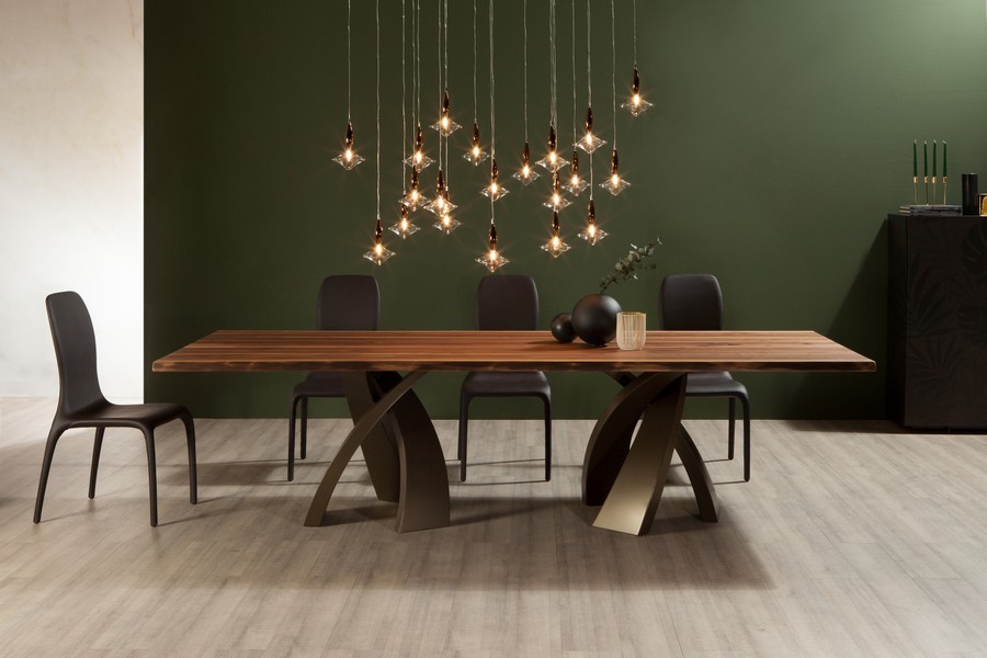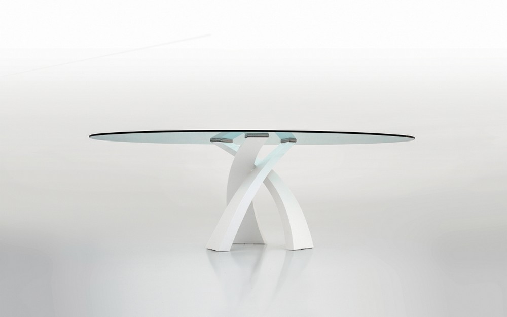 Eliseo fixed table by Tonin Casa with base with three legs that cross each other in lacquered metal, the top is glass, wood or stoneware available in several sizes. A wooden top in different essences, or UV-welded tempered glass on a steel plate; all resting on a curved and painted metal base, to obtain an effect of great aesthetic refinement. With Eliseo, an extremely refined dining table is born, also available in a tricolor and double-base version, capable of adapting to rooms of different sizes.