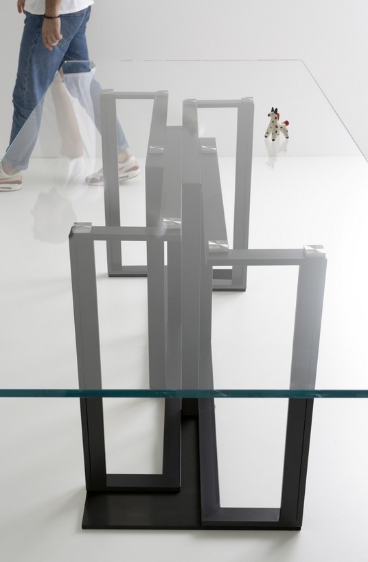 Table with structure composed of a rectangular section tubular joined manually with the brass brazing technique to create a unique structure with industrial formalism. The tops are available in transparent or smoked tempered glass and ceramic coupled with the glass.