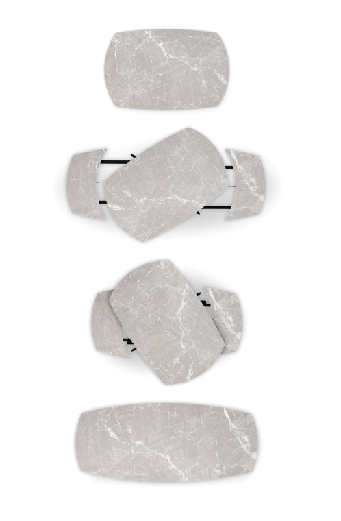 The Giove plus table features an innovative automatic opening mechanism that is activated simply by rotating it. Thanks to this technology, the top extends smoothly and effortlessly, offering more space in just a few seconds. The modern and elegant design, with inclined legs and a stone-effect ceramic top, makes it perfect for sophisticated and contemporary environments. The combination of aesthetics and functionality makes it an ideal solution for those looking for versatility and style in a single piece of furniture.