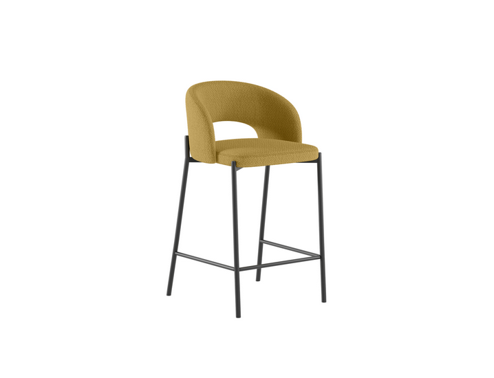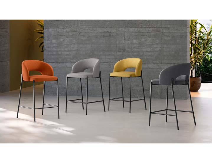 Greta, a padded fabric stool, features a circular backrest that ensures a structure that embraces the shape of the body, ideal for relaxing during an aperitif in company.