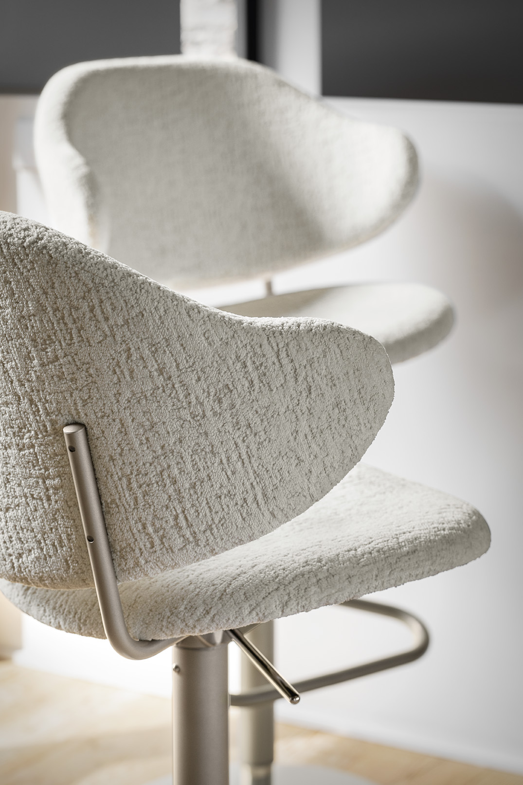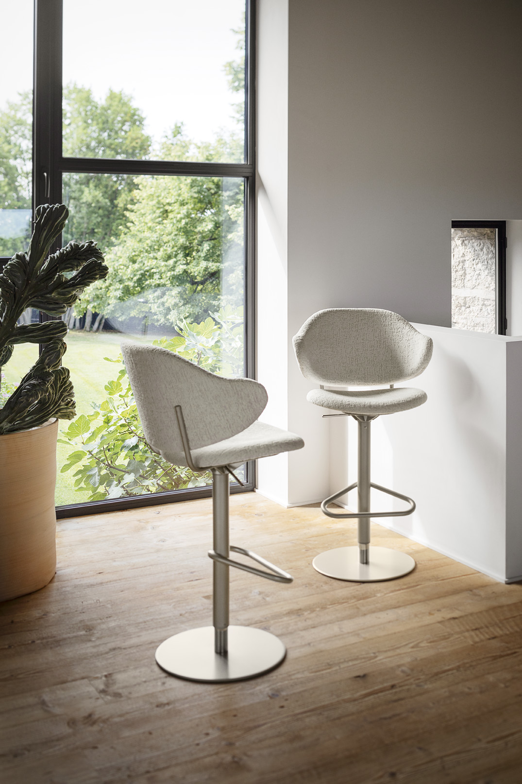 This stool stands out with its enveloping, padded and generously sized backrest that allows you to comfortably rest your arms.