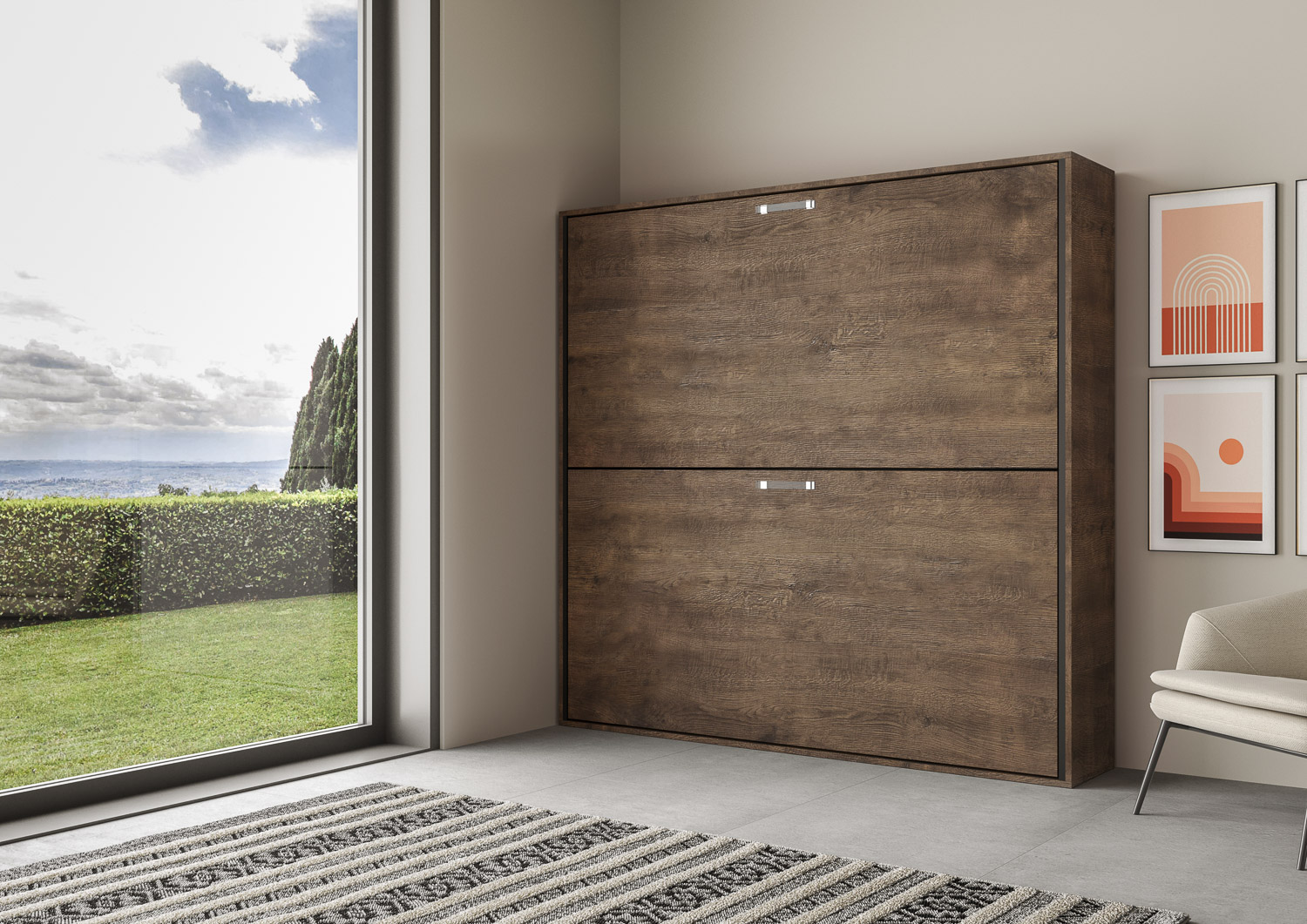 Horizontal foldaway bed Kando version with two single bunk beds. A practical and original space-saving solution that allows you to make the most of every single centimetre of surface, allowing the possibility of transforming a living area into a sleeping area in a few simple moves. Also ideal for those with limited space available. When closed it takes up relatively little space, when open it offers the same comfort and rest as a normal single bed. Bed structure made of 18 mm thick melamine particle board. Reinforced iron bed base structure painted with epoxy powder, embossed aluminium colour. The opening mechanism is equipped with an anti-closure system with safety lock with side release handles. Includes orthopaedic bed base made of 85x190 cm laminated wood slats with mattress retaining straps. Mattresses not included. Recommended mattress dimensions: 85x185 cm H.max 14. The bed remains stable thanks to an internal safety mechanism that ensures its rigidity. The bed can be opened as needed, only the upper bed, only the lower bed or both at the same time. The lower bed is equipped with extractable feet that allow the lower bed to rest on the floor in complete safety, while the upper bed is equipped with practical ladders for going up or down. The lowering of the beds is made easier by the handles included. Important note on assembly: The Kando foldaway bed arrives disassembled. Assembly is very difficult and requires two expert people to do it. Fixing to the wall is mandatory. Dimensions: Closed bed to the wall: L.199.9 D.39.2 H.190.8 cm Open bed: L.199.9 D.106 H.190.8 cm Height from the ground of the lower bed: 33 cm Height from the ground of the upper bed: 127 cm Made in Italy. Product Itamoby