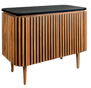 Invilla 100 mahogany is immediately recognisable by the natural teak rod inserts that design the midnight black surface of the furniture and by the curved shapes without edges or handles.