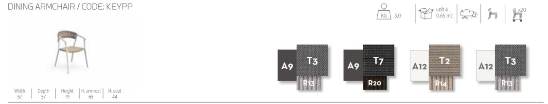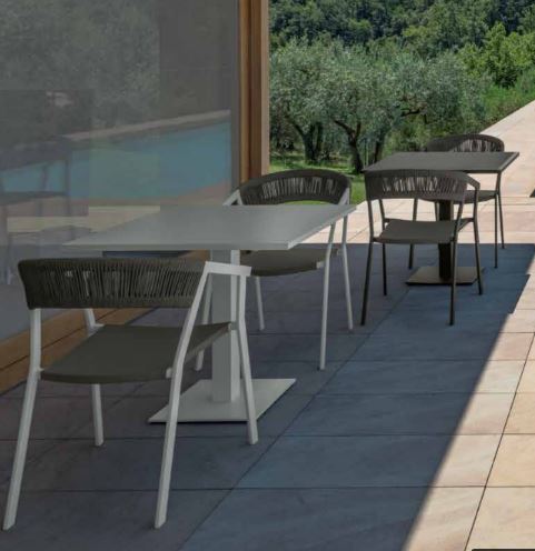The slender chair suggests lightness and stability. The backrest is obtained by bending the rectangular section aluminum tubulars and is covered with rope. The cushion is in textilene.