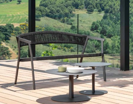 The Key collection sofa expertly combines lightweight materials with elegant forms. The aluminum frame supports the body with textilene cushions, held in place by the collection's signature synthetic cord weave.