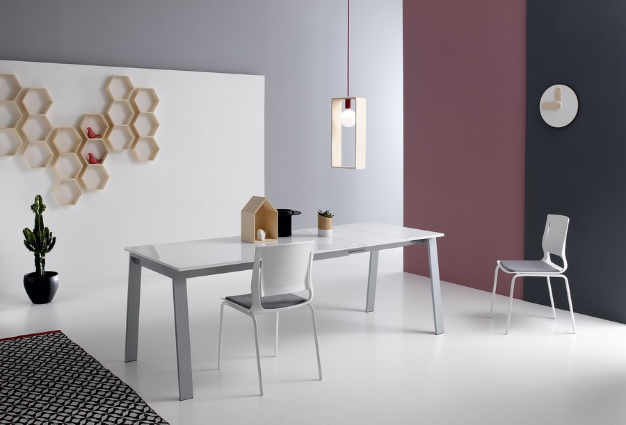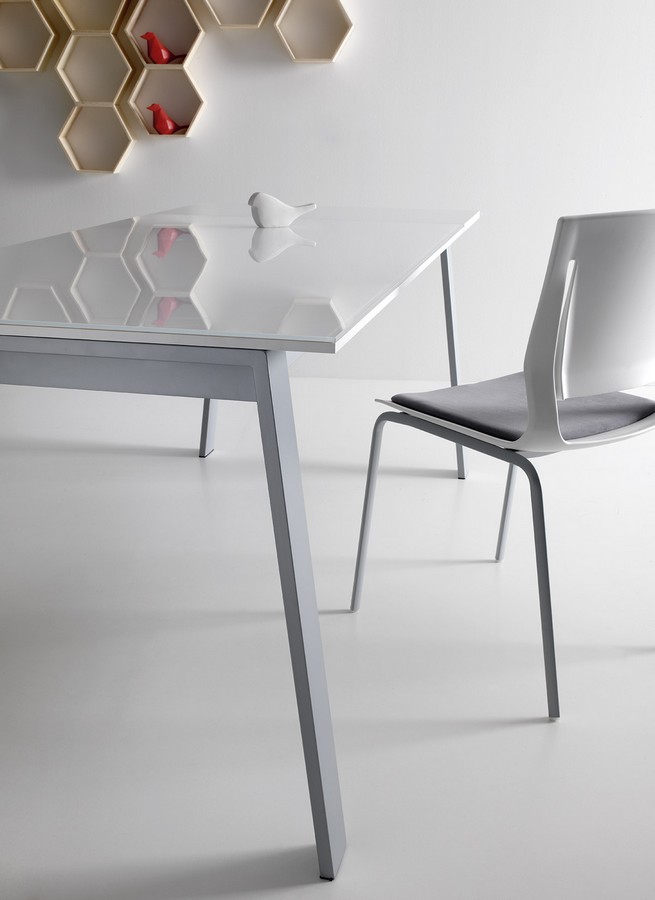 The Delta table was born from the need to design a functional product with a personalized aesthetic. Characterized by its distinctive fixed leg and tilted frame, the opening mechanism is mounted on aluminum runners. The top is available in melamine, laminate, or tempered glass.
