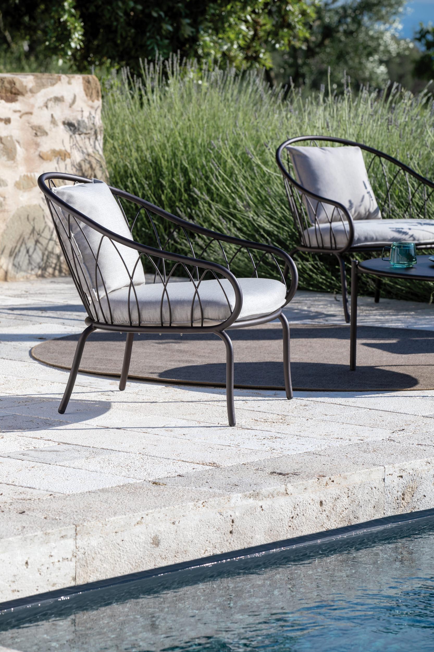 The Flora line by Vermobil presents this low armchair that can be combined with the rest of the components that can form an elegant and practical outdoor lounge. Available with an iron structure in different colors and two fabric cushions on the backrest and seat in different finishes. Made of resistant materials, this armchair will allow you to bring elegance even outside the home.