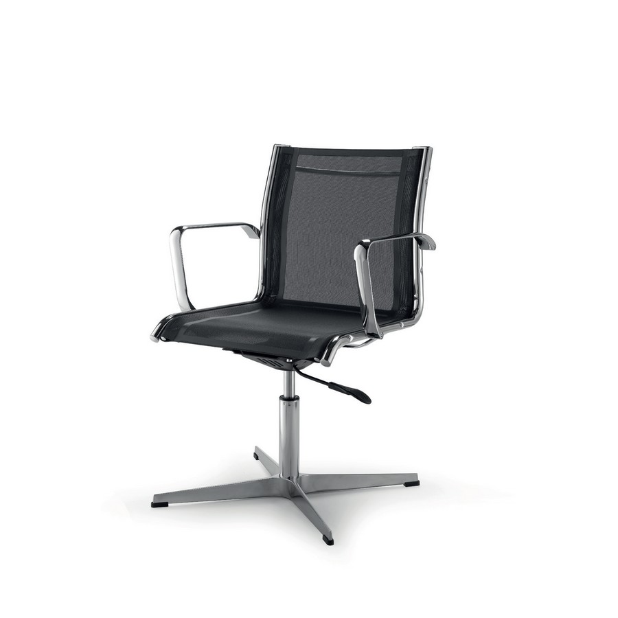 Lux office chair by Olivo & Groppo with Net fabric seat in a variety of colors and a 4-star polished aluminum base. This versatile and elegant executive chair stands out for its sophisticated technical and aesthetic solutions. The high-quality Net mesh fabric, combined with chrome finishes and polished aluminum, enhances the design and makes it suitable for any functional setting. A unique covering, a single-layer PVC mesh, further enhances the chair's design. Thanks to its variety of functional, aesthetic, and mechanical solutions, it is a valuable and elegant furnishing element, even for waiting rooms or meeting rooms. Available without armrests or with chrome-plated aluminum armrests.
