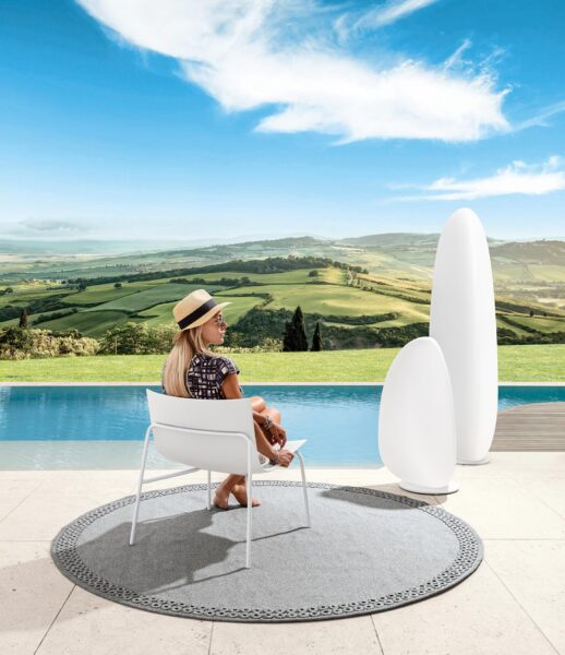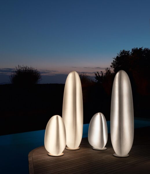 The Malè floor lamp has a stainless steel frame covered in translucent plastic material that matches perfectly with the other elements in the collection.