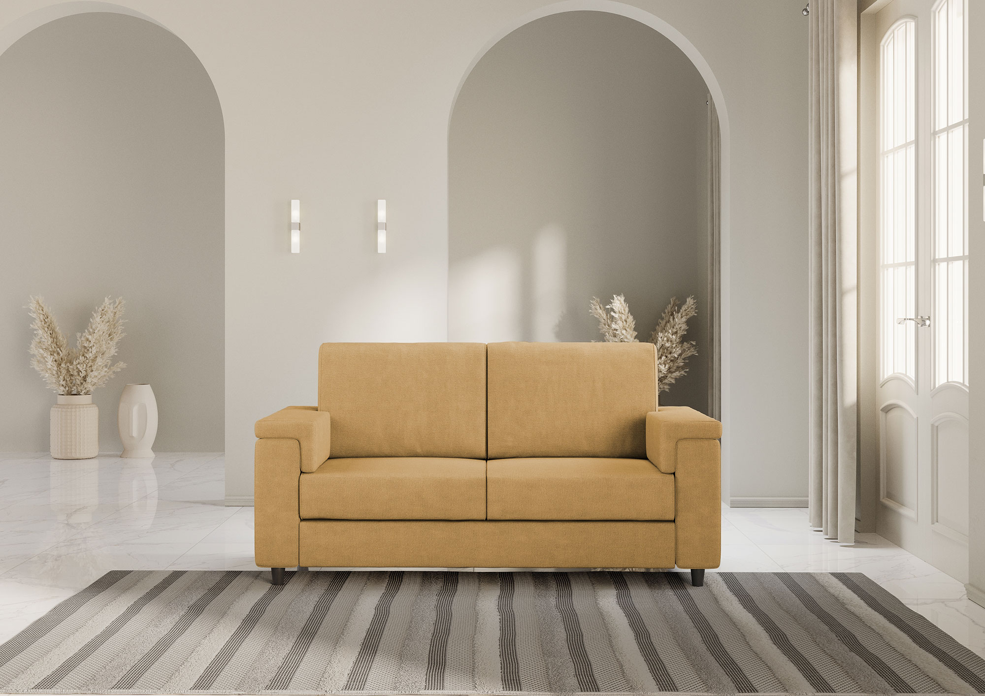 Add a touch of style and comfort to your living room with our 2 seater sofa. With an elegant and comfortable design, this sofa is the perfect addition to create a welcoming environment in your home. The sofa seat is designed to offer exceptional comfort thanks to the uniform distribution of the weight on the cushion and the contact with the backrest. You will be able to relax and enjoy pleasant moments of rest without worrying about discomfort or pain. Made of high-quality materials, the sofa features a sturdy frame and high-density foam padding that ensure durability and long-term comfort. You will be able to enjoy your sofa for years without losing its elegant appearance and comfortable performance. The elegant and modern design of the sofa adapts easily to any environment and furnishing style. The clean lines and minimalist look add a touch of sophistication to your living room. Furthermore, the colors of the coverings are versatile and easy to match with the rest of the furniture. The Marrak 2-seater sofa is the ideal choice for those who want maximum comfort and style in their home. By adding it to your space, you can create a welcoming environment for you, your family and your friends. Enjoy pleasant moments of relaxation and conviviality, knowing that you have a quality sofa that will accompany you over time.