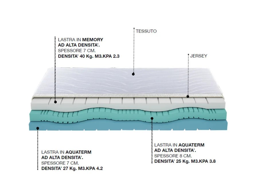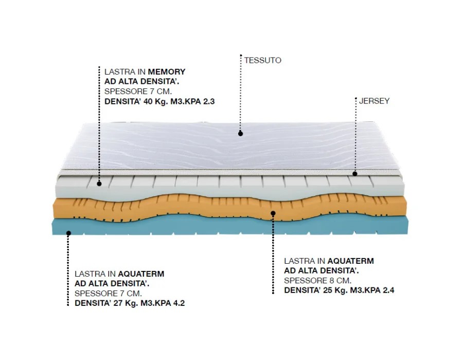 Innovative and scientific research into materials has made it possible to create this highly technological compound with exceptional results. Ergonomic as it molds perfectly to every part of the body, providing perfect and balanced support; thermosensitive because the body temperature acts on the molecular structure of this material making it soft and flexible; slow memory as it is able to slowly recover its original shape. It also has strong hypoallergenic, anti-mite, antibacterial and antistatic qualities. Memory Gold SOFT MAXXI