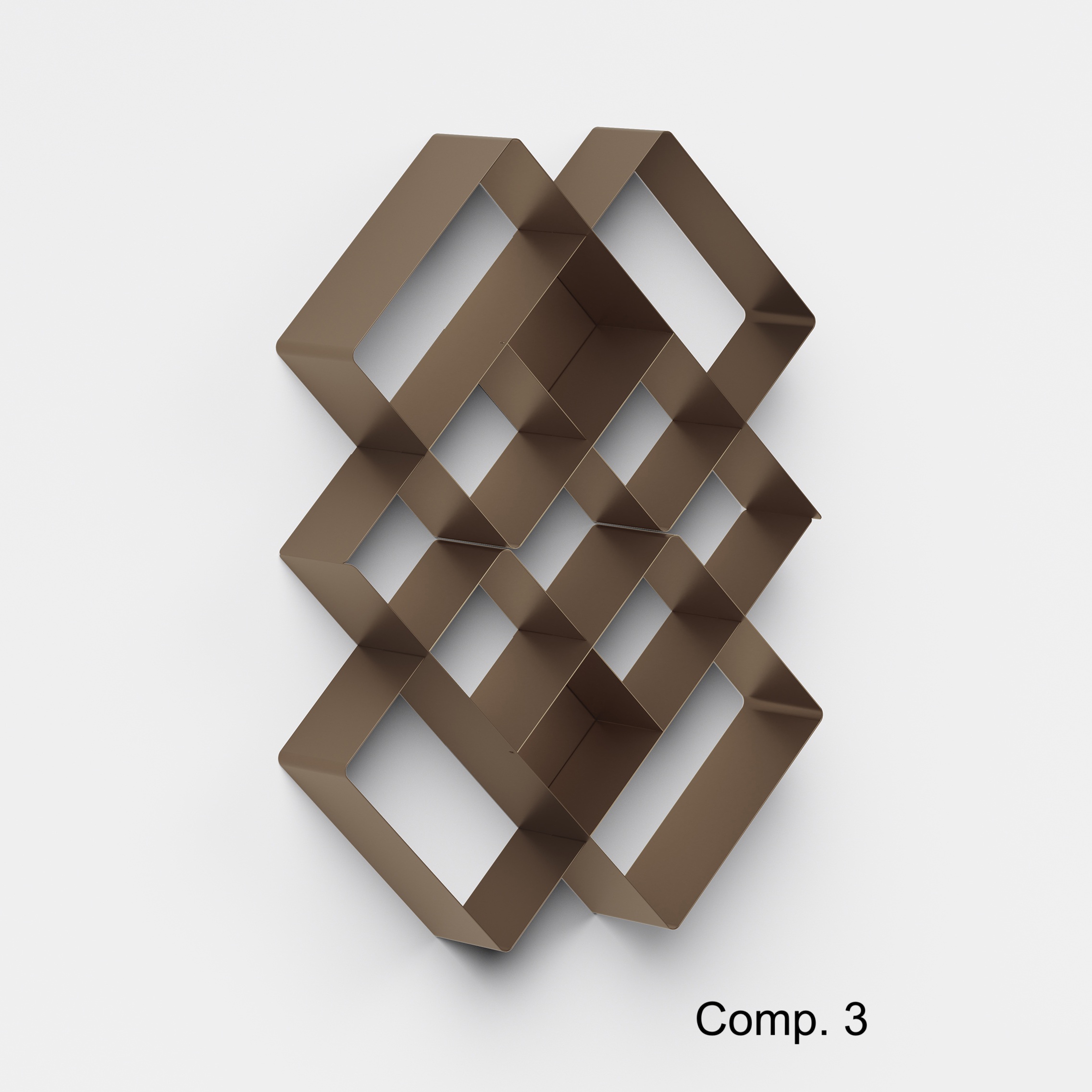 Modular bookcase in painted steel. The base unit is composed of two interlocking mirrored elements with different depths (22 cm and 25 cm), plus a colored back panel in the center.
