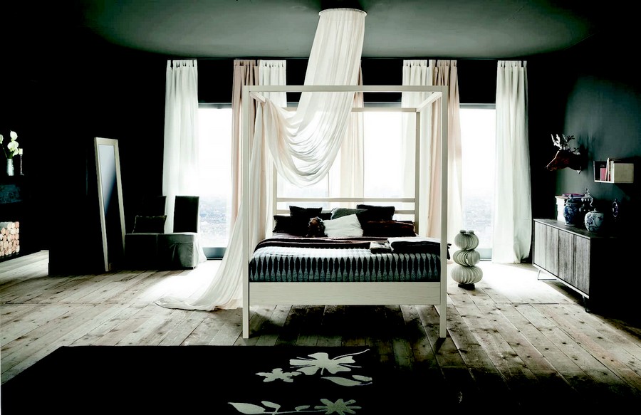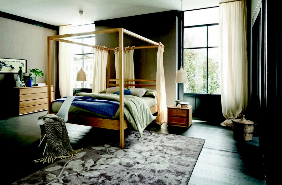 Nemo canopy bed by Altacorte with solid oak wood structure in multiple finishes and colours. Simple yet elegant, this bed is one of a kind. Available in two sizes.