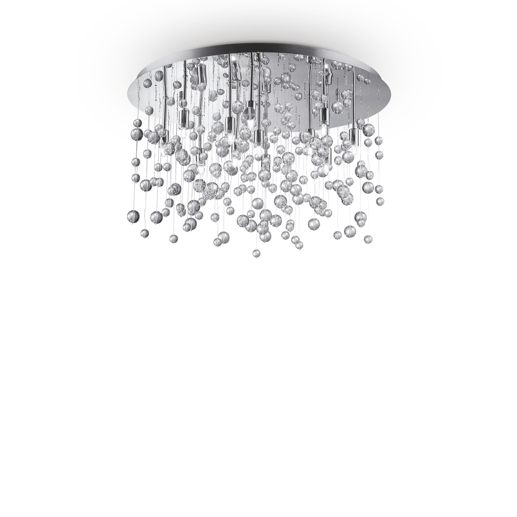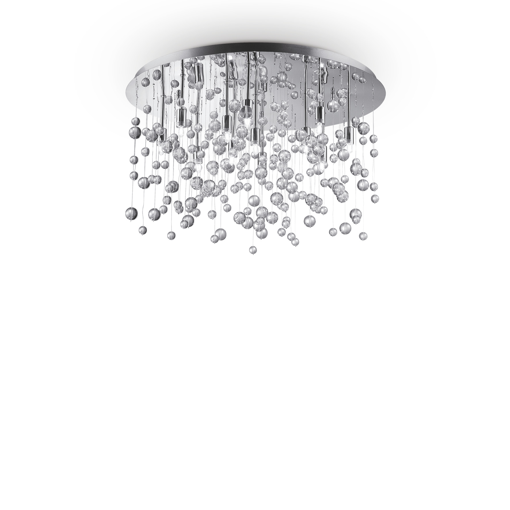 NEVE PL12 chrome ceiling chandelier by Ideal Lux with metal frame. Decorative elements with glass spheres fixed to nylon threads. Available with chrome frame and transparent spheres. LED bulbs included.