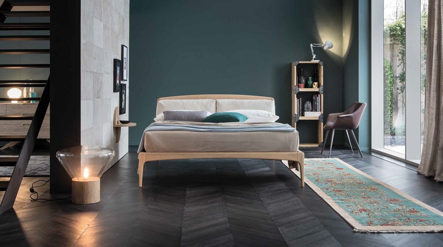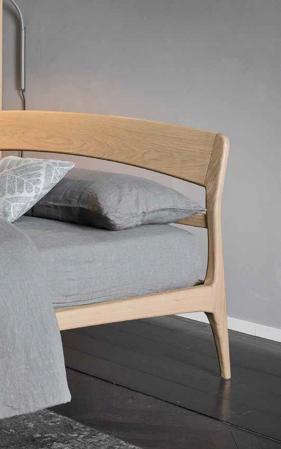 The Nice bed is crafted entirely from solid European oak with solid elements, including side members and a footboard with a sophisticated arched effect achieved only through precision craftsmanship. Available in two versions, "Short" and "Long," the latter featuring a pair of feather and polyester flake cushions with removable fabric, leather, or eco-leather covers.