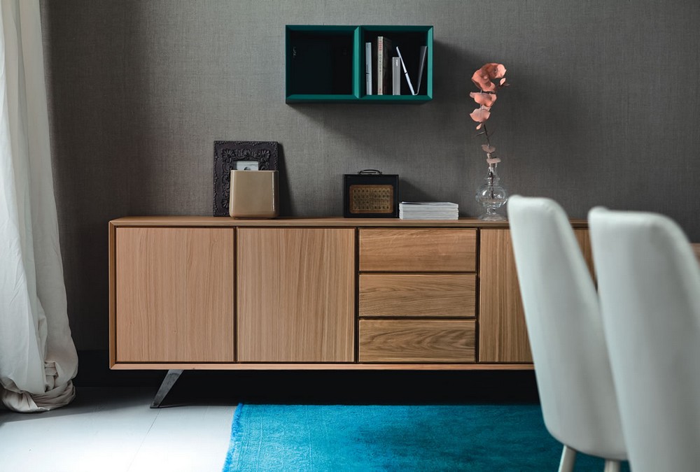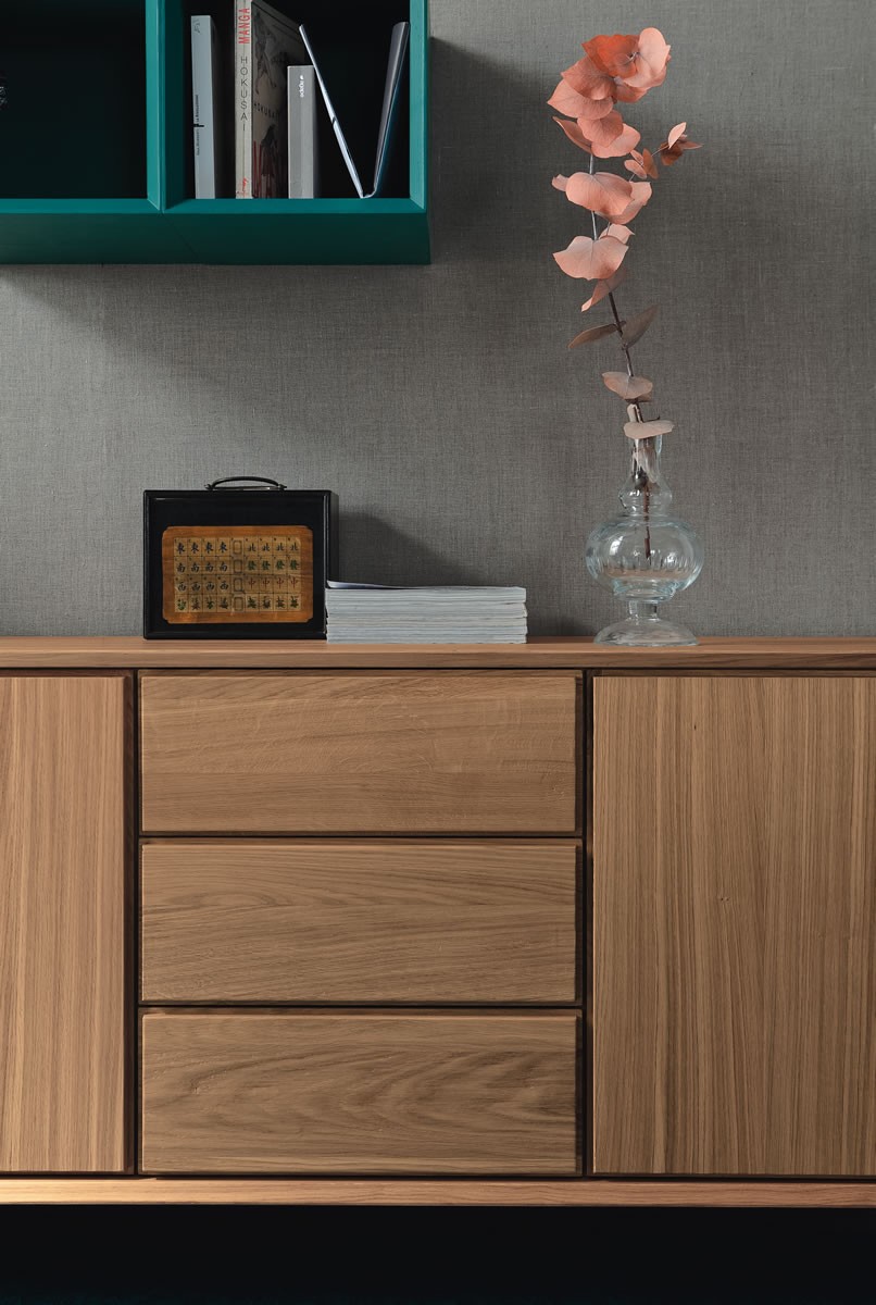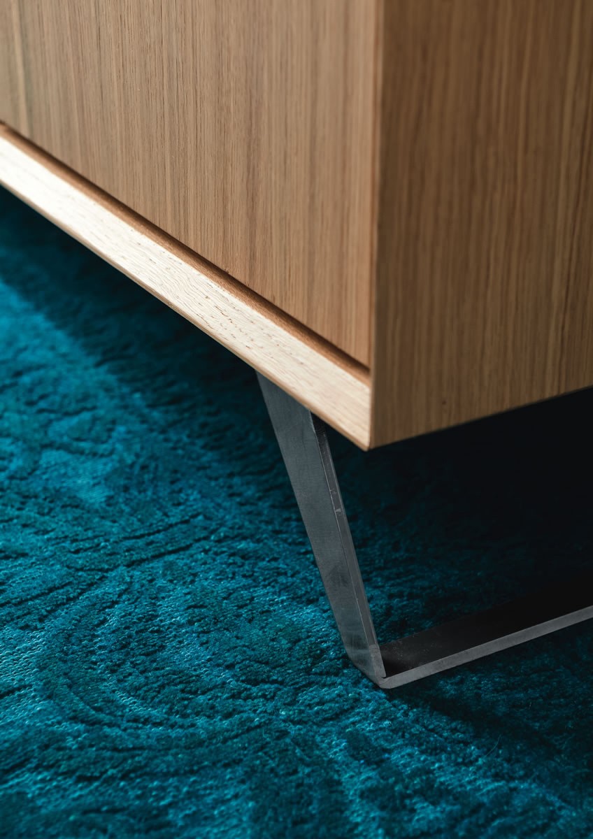 The Nook sideboard by Altacorte in oak or walnut with three hinged doors and three drawers available in different colours, with an important design that combines the warmth of the wood with the modern line, is truly a true protagonist in any furnishing environment. A sideboard with a shell entirely in oak or walnut wood, shaped by the skilled hands of expert craftsmen. An essential but never banal line. Available with wooden base or with inclined steel bracket.