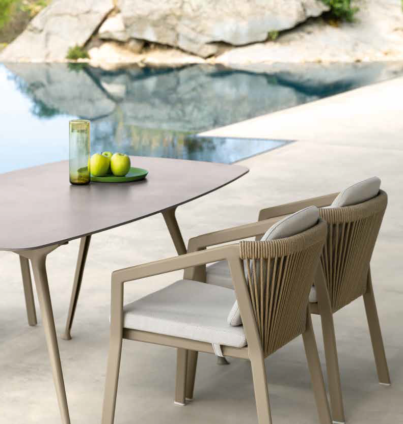 Nova dining table by Talenti with powder-coated aluminum frame and stoneware top.