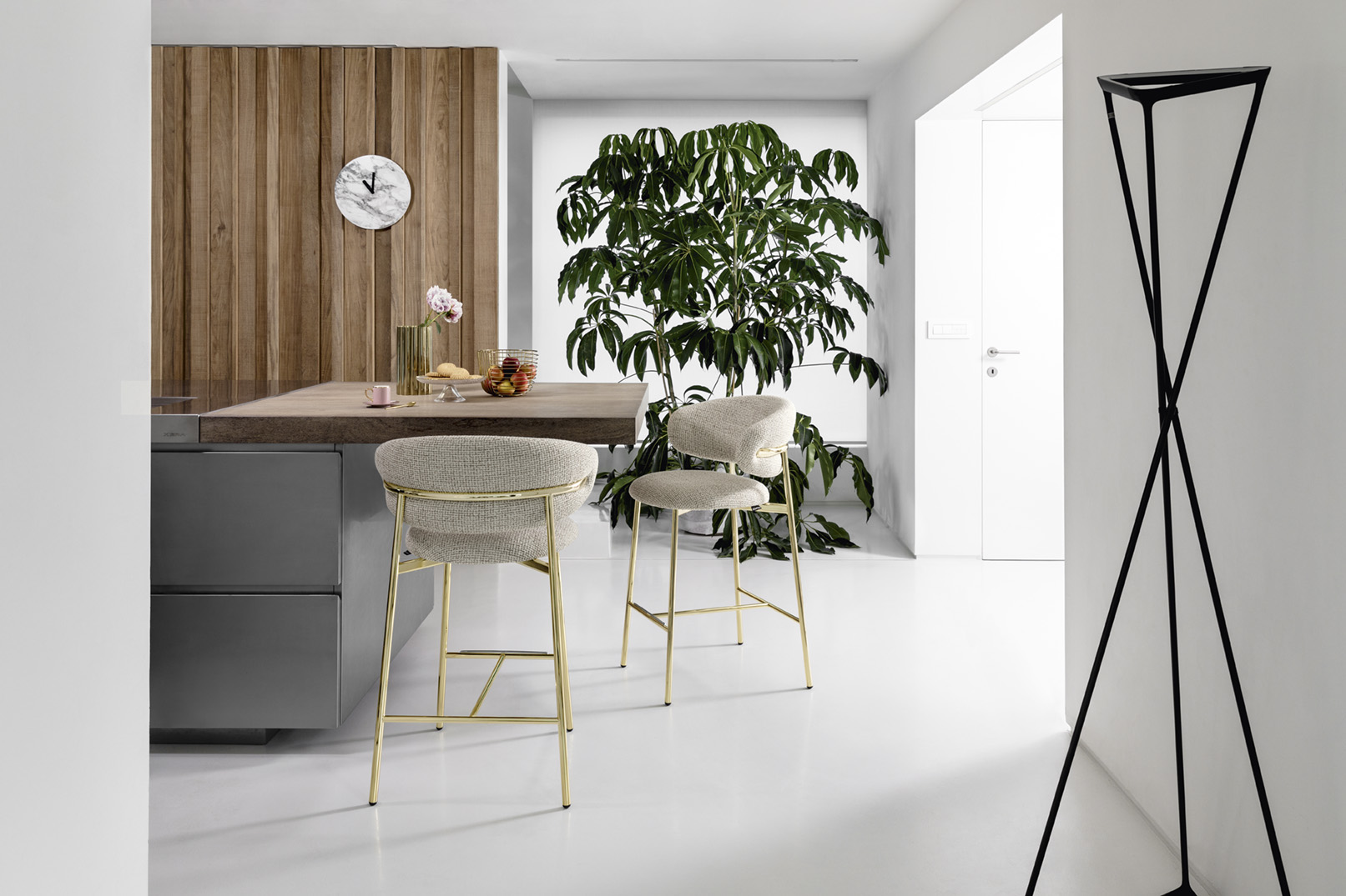 Seating focused on comfort: seats and backrests are characterized by generous and soft padding available with different types of upholstery. Oleandro is recognizable by the characteristic flattening of the backrest, present in both the wooden and metal versions. The depth of the seat, the generous padding and the enveloping lines give chairs and stools extra comfort.