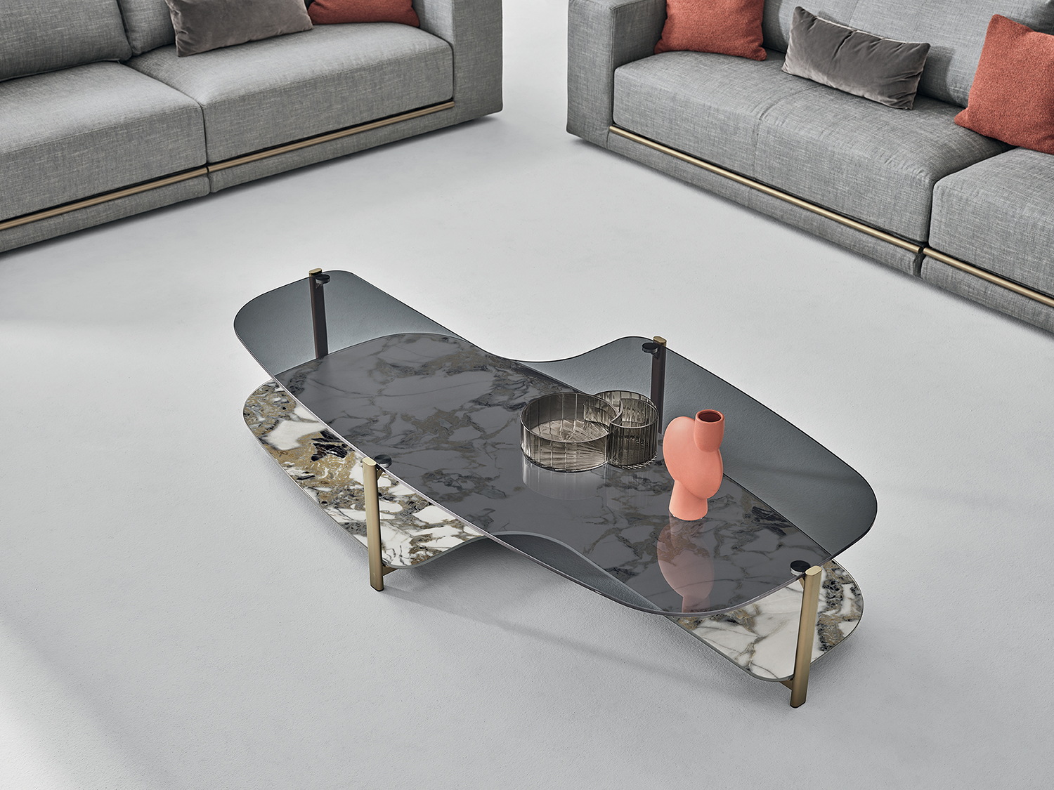 Pagoda coffee table by Bontempi with steel structure, upper top in polished glass, while the lower top is available in numerous materials and finishes.