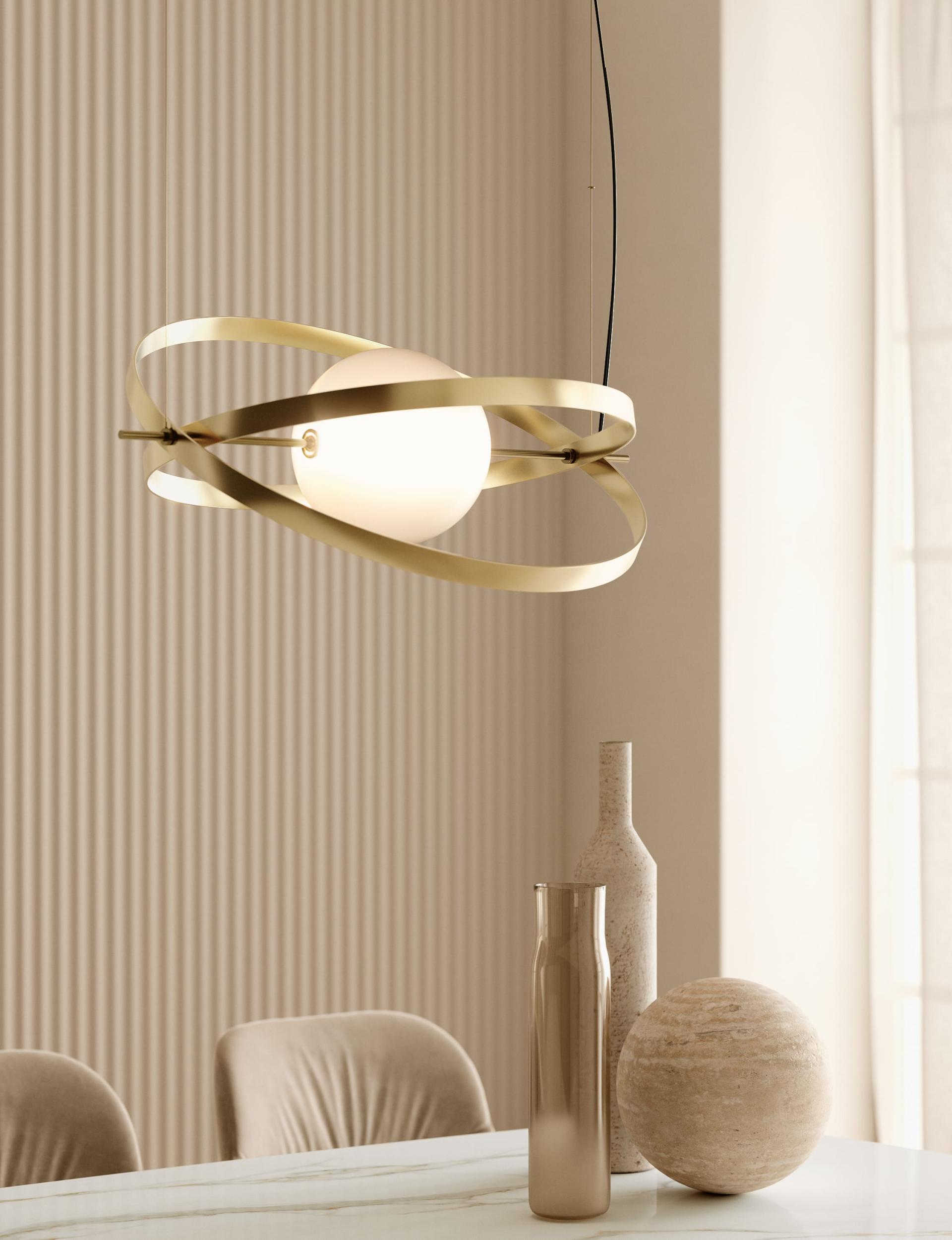 Papillon suspension or sky/ground fixing lamp, with matt black or gold painted steel structure and sandblasted glass sphere. Available in two versions: the suspended one and the sky/ground fixing one.