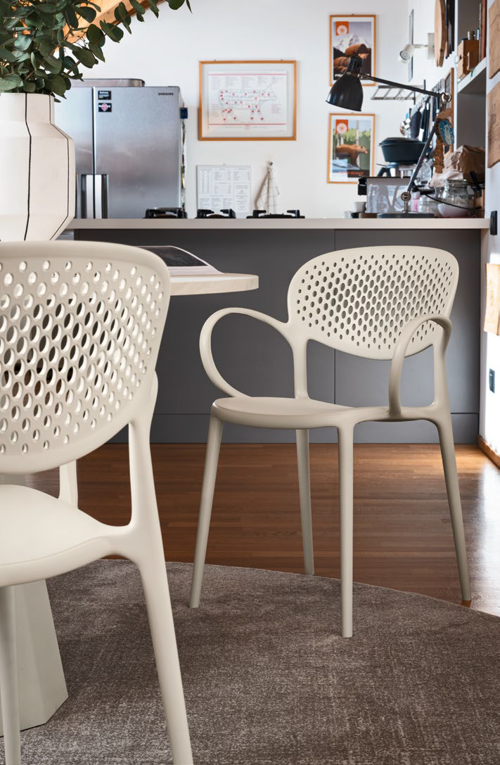 Abby chair by Connubia with perforated backrest in polypropylene available in various colors, made with airmoduling technology and with interchangeable high-resistance PE feet. A composition of degrading holes decorates the surface of the backrest, making it more airy and suitable for outdoor use. Made of 100% recycled polypropylene, it is a versatile seat thanks to the possibility of being stacked with and without armrests.