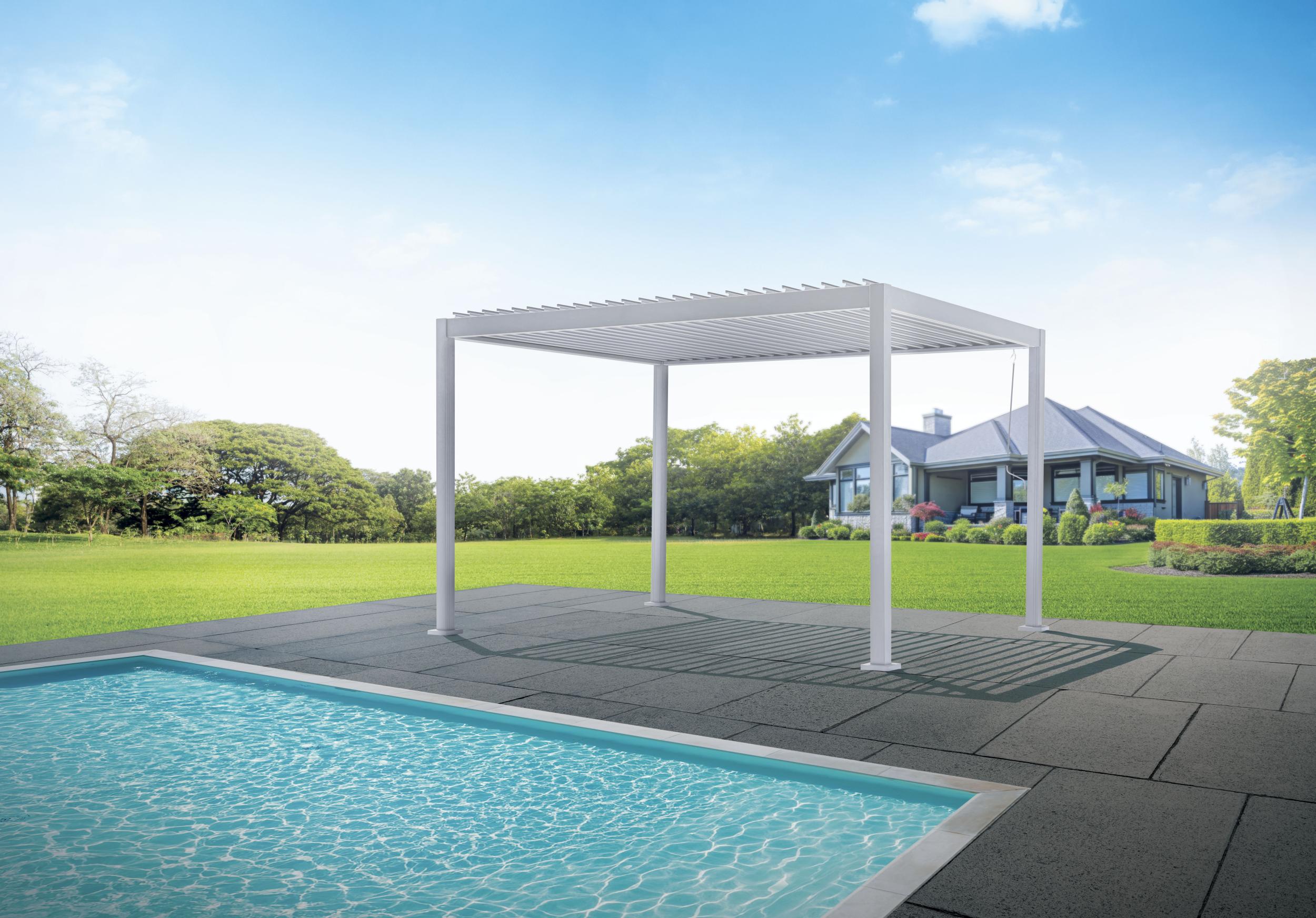 Roof crosspieces 145 x 80 x 1.3 mm, slats 162 x 27 x 1.2 mm, slatted roof adjustable by crank, max height 2.50 m, water drainage system integrated inside the load-bearing poles.