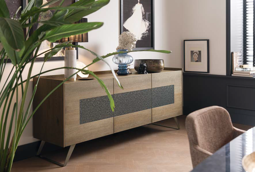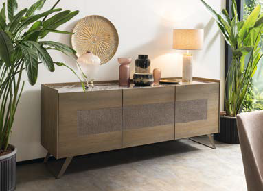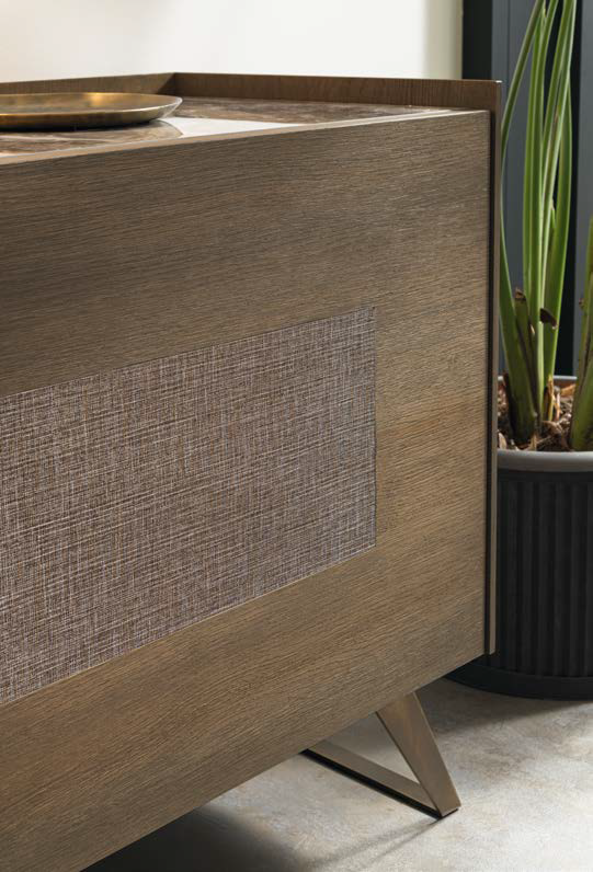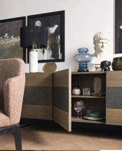 Rear-finished Tiffany sideboard by Altacorte with three hinged doors and three internal wooden shelves available in numerous finishes . Possibility of choosing between multiple variants also for the base of the sideboard. Linear, rational, balanced, the Tiffany sideboard with metal base, oak body and doors with fabric inserts, is available in many finishes with a wide variety of combinations.
