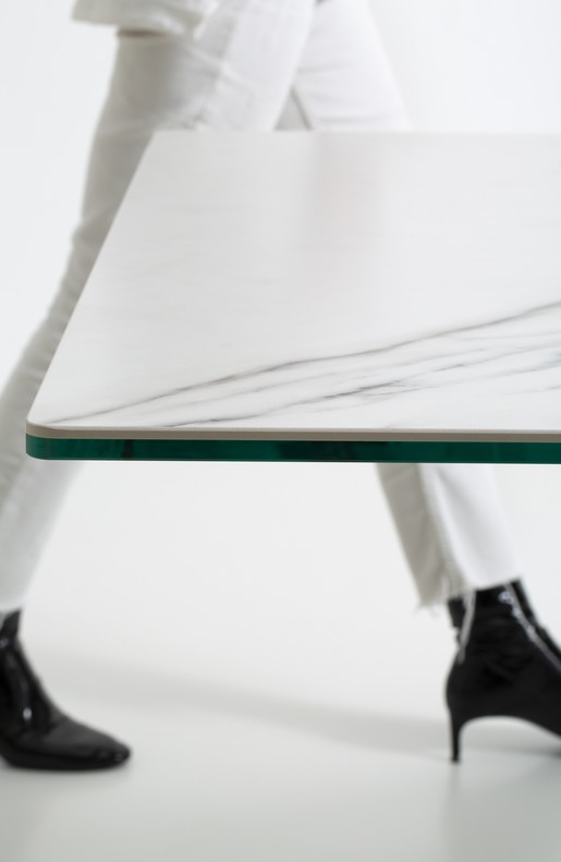 Fixed table with central base in epoxy powder painted metal. Peculiarities of the base are the visible unions created thanks to laser cutting technology. The extendable version has a synchronized central opening mechanism which includes 2 40 cm extensions. The choice of top varies between veneered wood, laminate, glossy and matt ceramic. An ideal table for warm and welcoming environments.