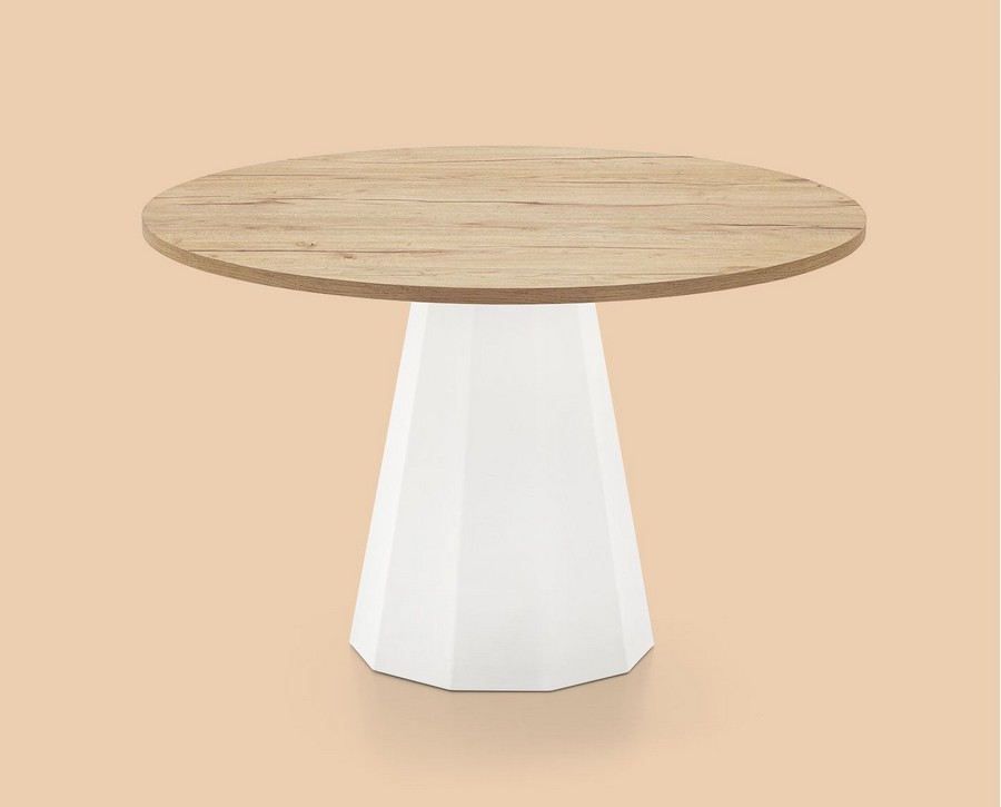 Fixed round table DIX, with base in faceted painted sheet metal with a conical decagonal base and is suitable for any type of floor thanks to the adjustable foot hidden inside and top in laminate, lacquered or melamine.
