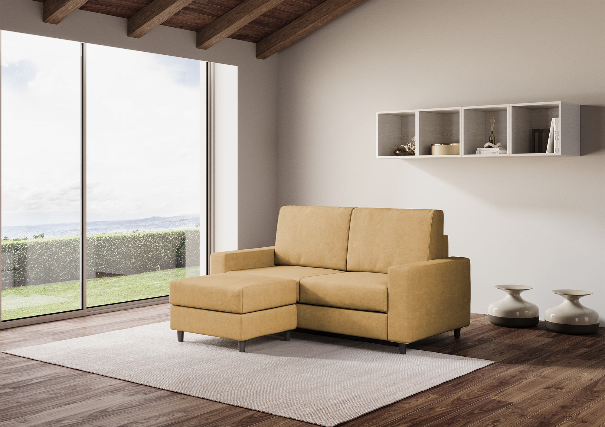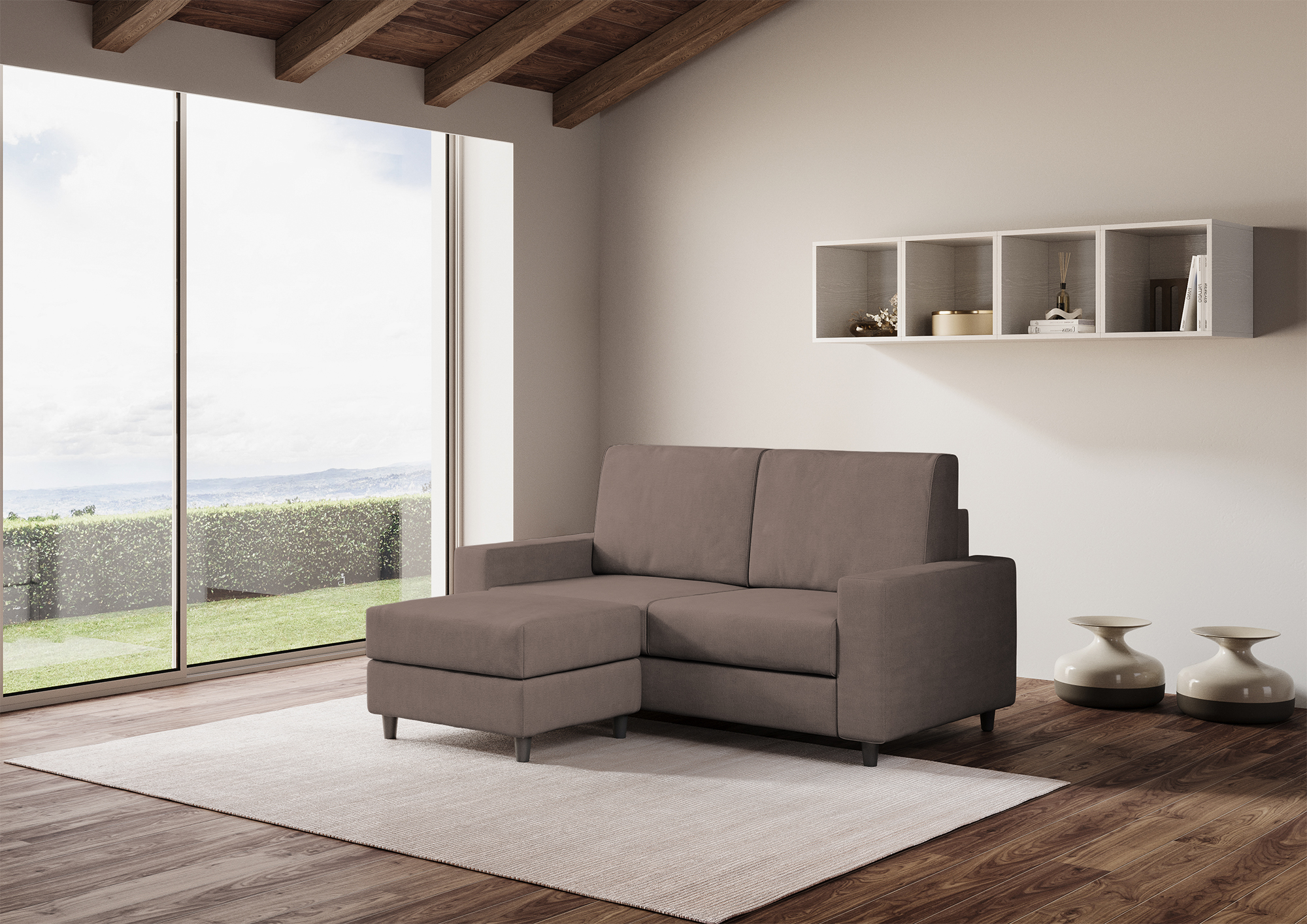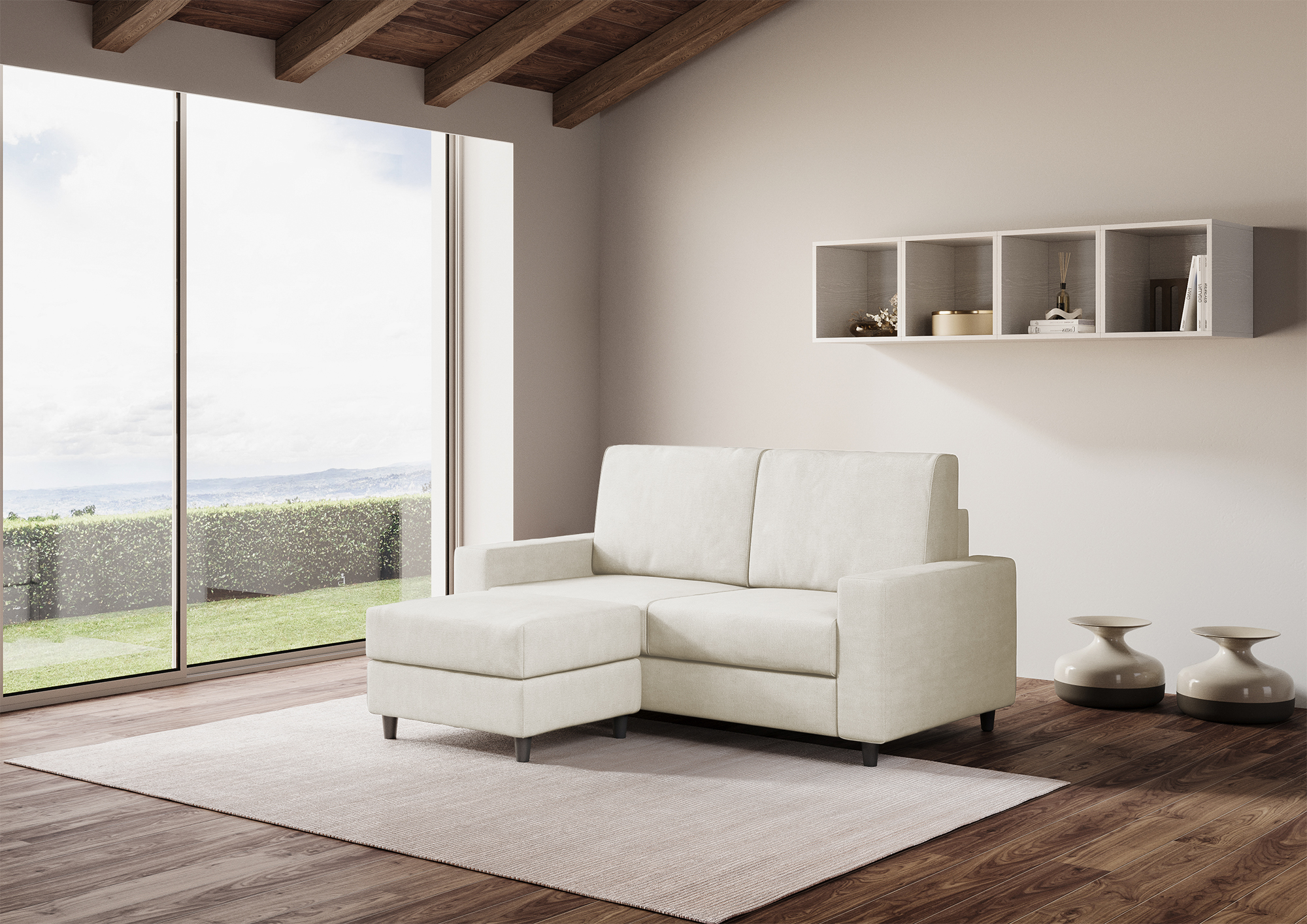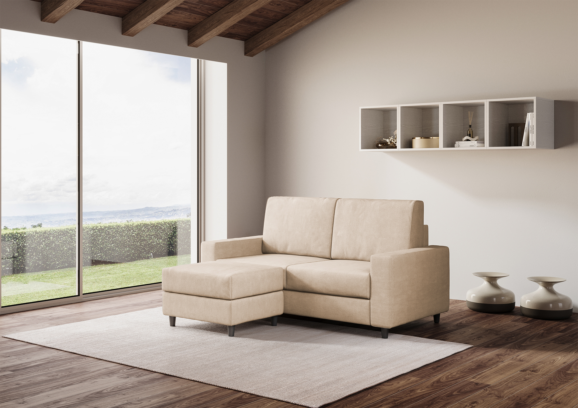 Completely removable cover, seat in contact with the backrest which ensures unique comfort. Seat height from the ground: 45cm. Height of wooden feet: 8cm. Fabric details: 100% polyester, water-repellent, weight approximately 320g/m2. Washing instructions: max 30°, ironable at low temperature, dry cleanable, no dryer, do not bleach. Stains caused by liquids can simply be removed with a damp cloth. Technical details of the seat: expanded polyurethane density: 24.6 Kg/m3, bearing capacity 40% 3.8 KPa Din 53577, pressure stress 40% 150N Din 53576/B, permanent deformation 50% 3% Din 53572. Technical details of the backrest : expanded polyurethane density: 14.7 Kg/m3, compressive strength 40% 1.5 KPa UNI EN ISO 3386-1, elastic yield: 38 UNI EN ISO 8307.