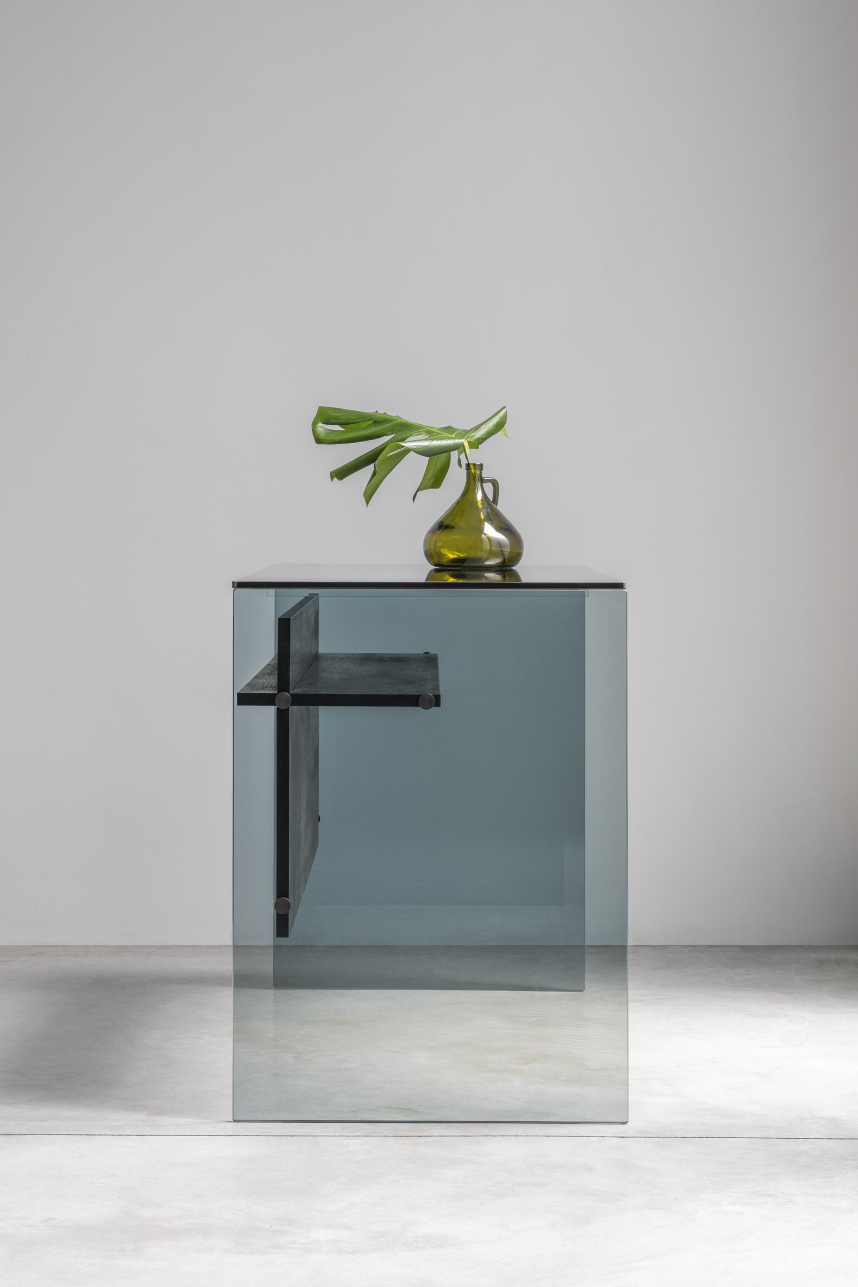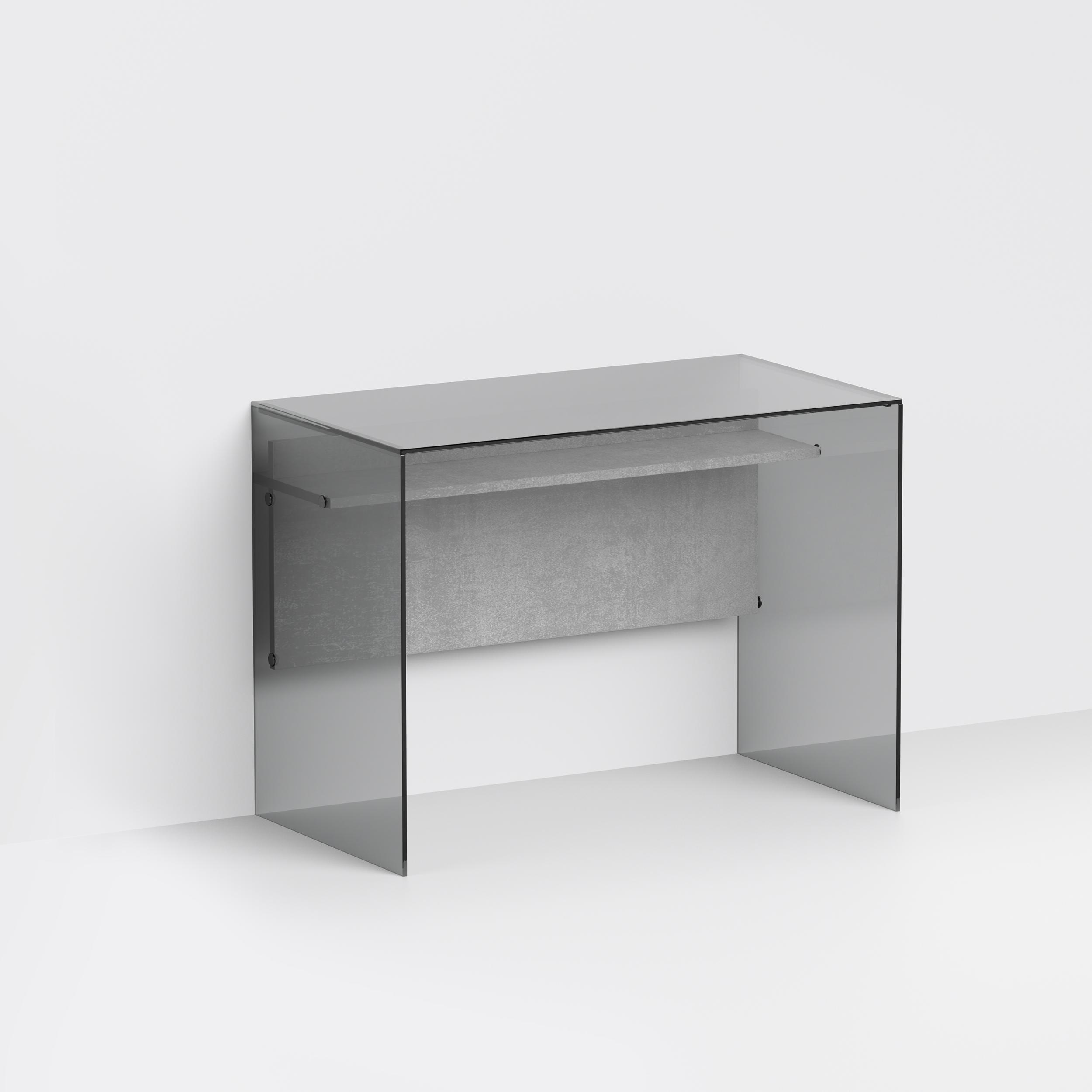 Desk with 10 mm thick tempered glass frame, available in two colors: clear or smoked gray. The practical shelf under the top, made of 18 mm thick eco-friendly laminate, is divided by a structural crosspiece. A power strip can be placed above (or below) the shelf behind the crosspiece. The fixings are made of satin-finish aluminum (with clear glass) or matte black anodized aluminum (with smoked gray glass).