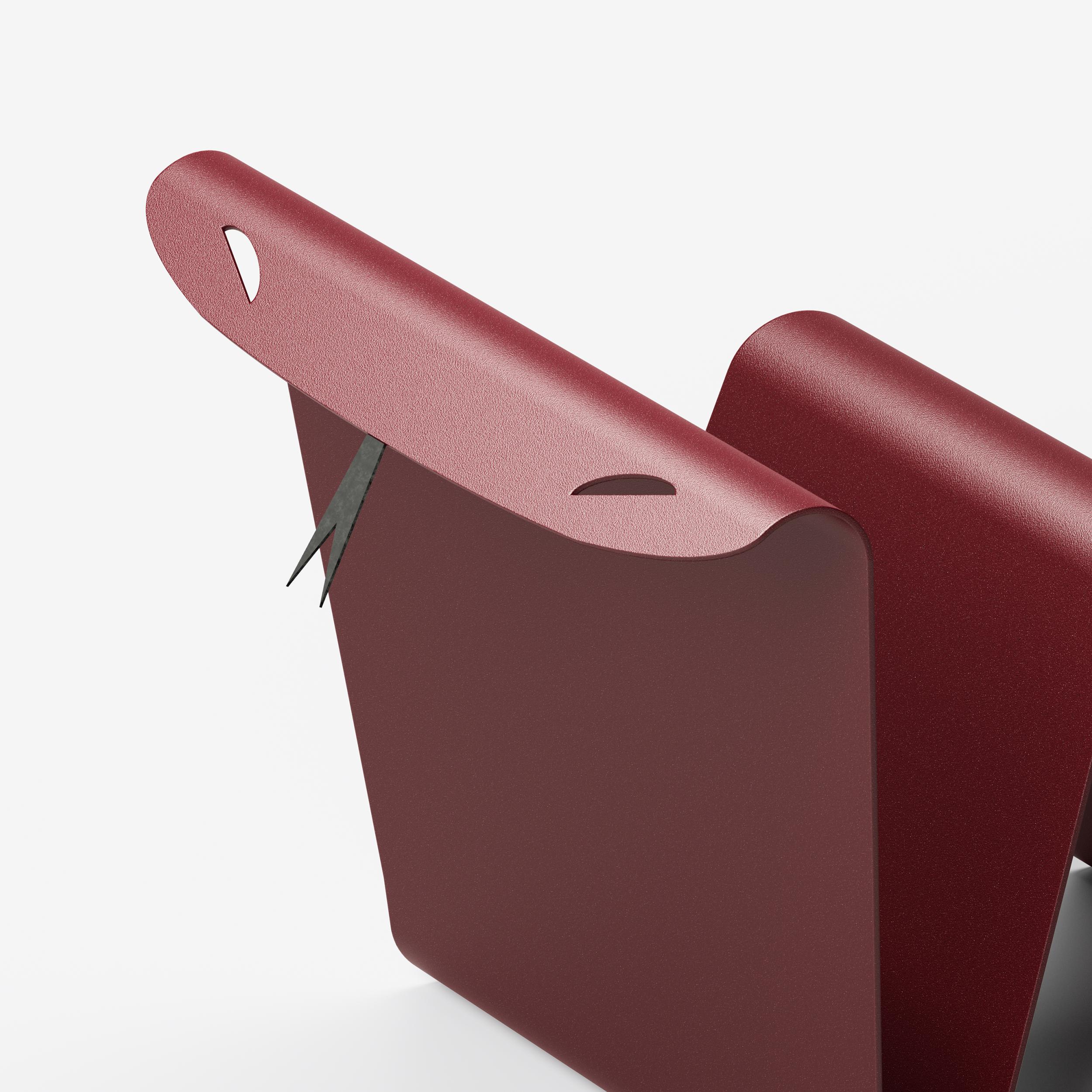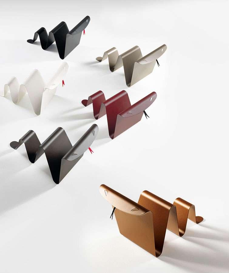 The Snake magazine rack by Pezzani is made of curved steel with a sandblasted finish, available in multiple colors. Not just a magazine rack, it's also a decorative and design accessory for your home.