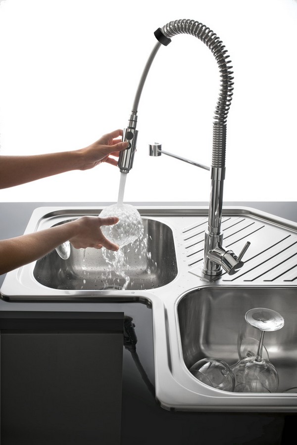 Spring mixer tap 1RUBMSGC by Barazza in chromed stainless steel. Shower faucet with double spout with 360 ° rotation possibility. Internal cartridge with ceramic discs. Beautiful functional faucet for your kitchen sink.