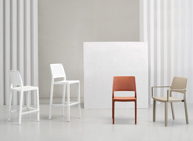 With a traditional aesthetic, decorated with small perforations, available in two heights and a wide range of colors, the stool version completes the Emi family. Easily stackable, it represents a versatile solution for outdoor spaces, such as beach bars and outdoor high tables.