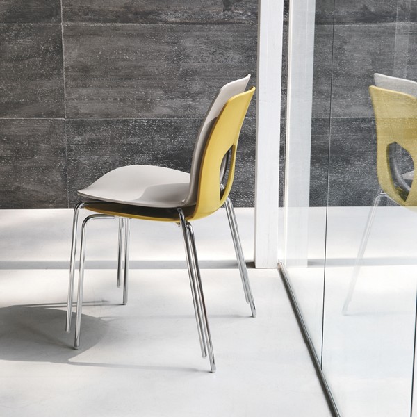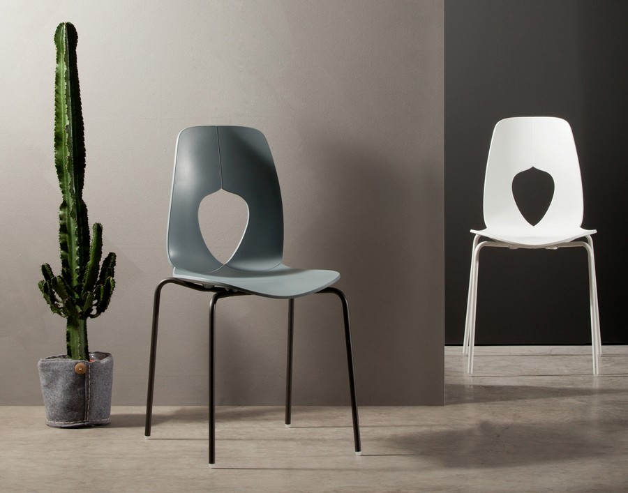 Elegance and practicality are the characteristics of the Hole stackable chair by Tonin Casa with structure in lacquered or chromed metal and molded seat in polypropylene, a material that allows the union of ecological sustainability and resistance. The metal structure matches the colors available for the shell: white, sand, cadet blue gray, slate gray, brick red and mud. An ideal seat both for a modern and refined kitchen environment and for the office.