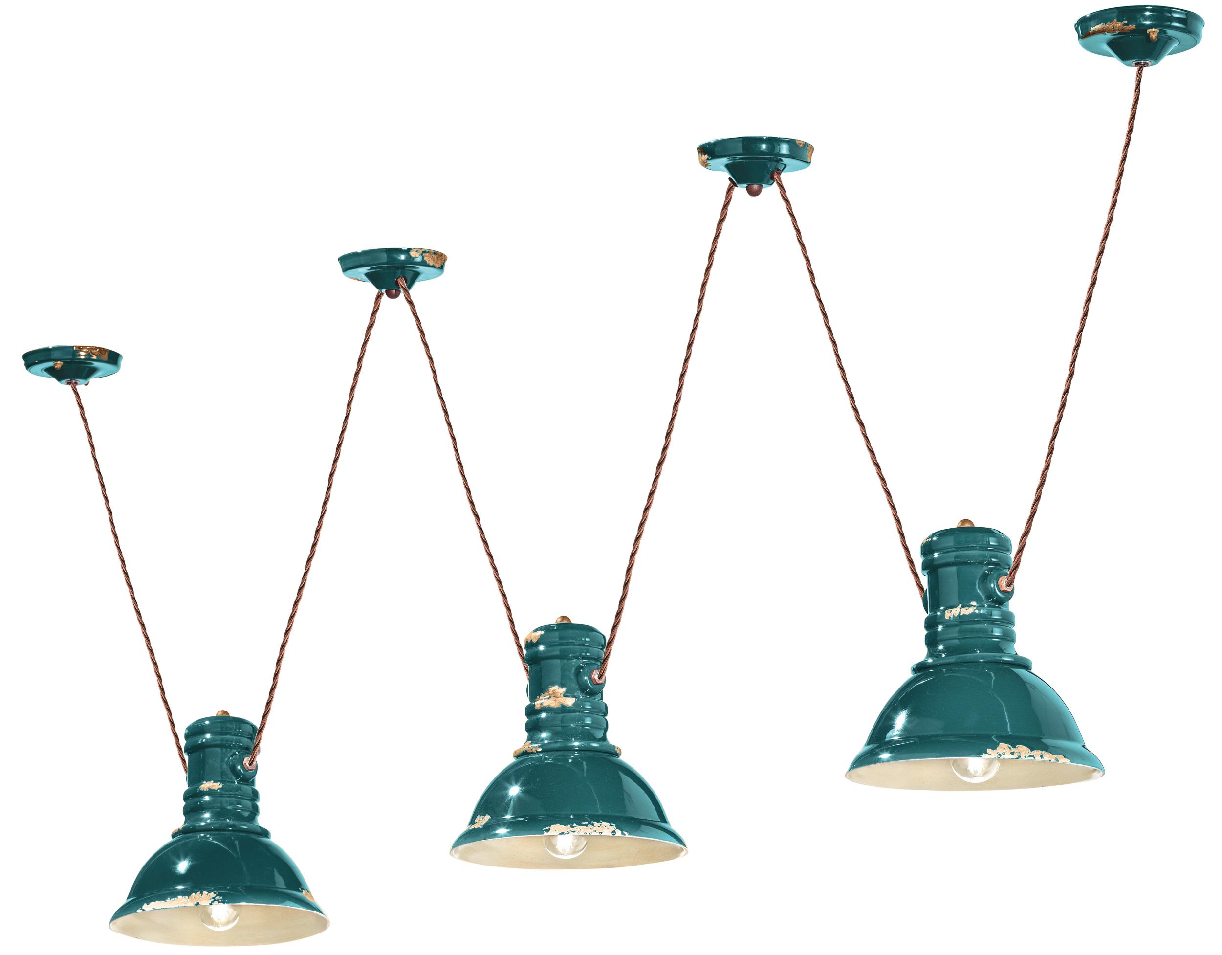 Suspension 3 lights RETRO' INDUSTRIAL C1692 by Ferroluce. Ceramic lamp with metal parts in antiqued corten iron and covered cotton cable.