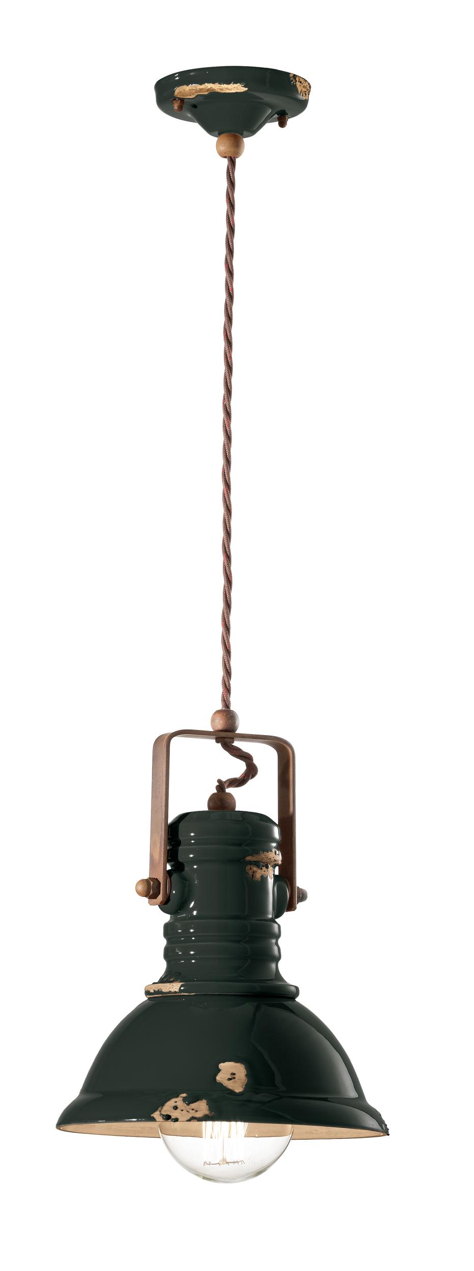 Suspension d.23 RETRO' INDUSTRIAL C1691 by Ferroluce. Ceramic lamp with metal parts in antiqued corten iron and covered cotton cable.