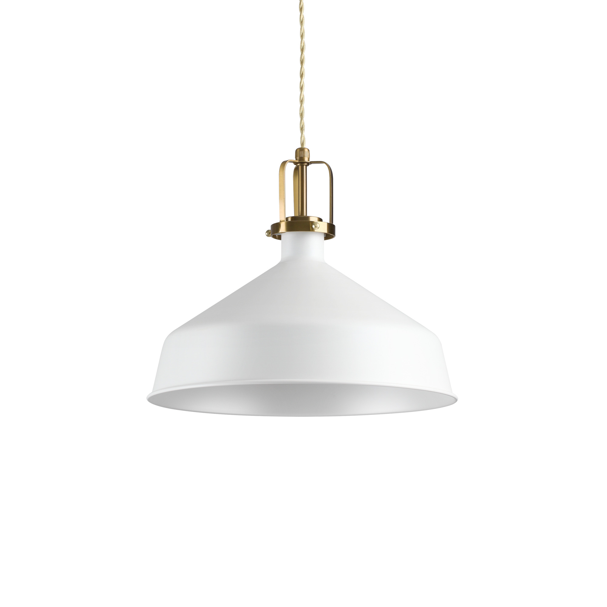 ERIS-2 SP1 white suspension lamp by Ideal Lux with metal frame with white painted ceiling rose and diffuser, satin gold finish details. Braided electrical cable with fabric covering. Bulb not included.