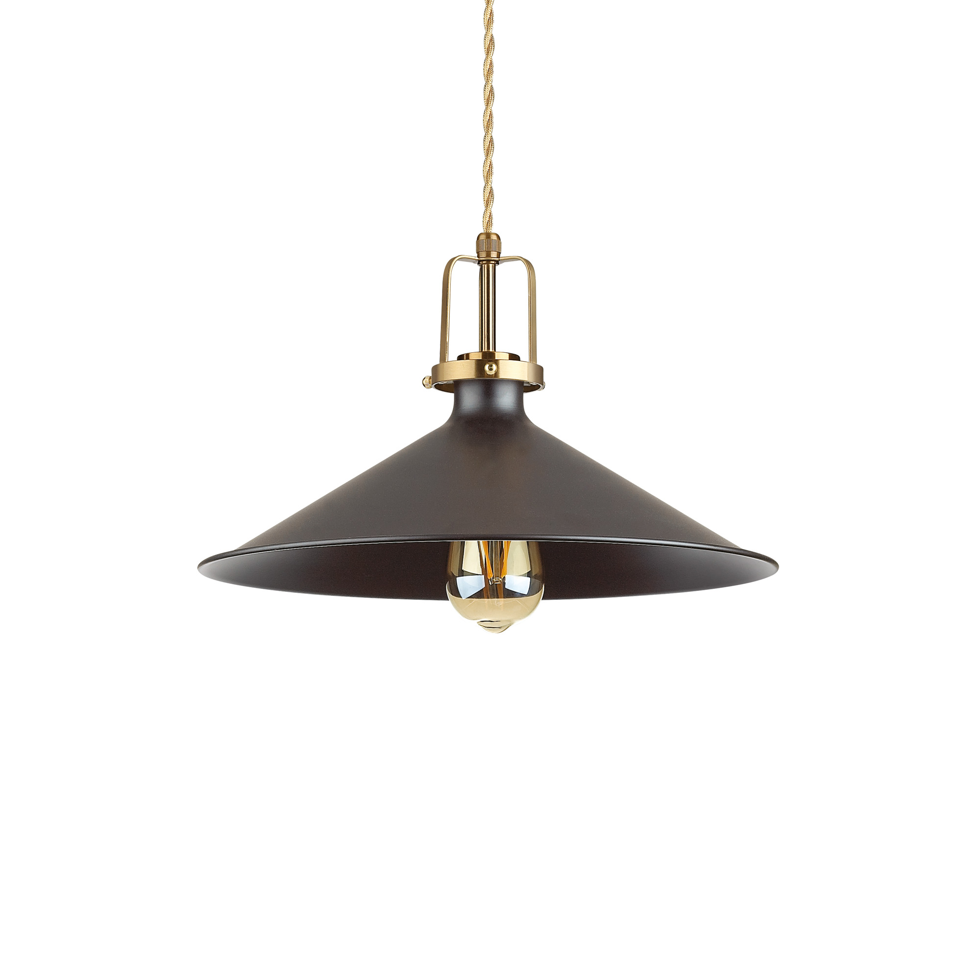 ERIS-4 SP1 black suspension lamp by Ideal Lux with metal frame with matt black painted ceiling rose and diffuser, satin gold finish details. Braided electrical cable with fabric covering. Bulb not included.