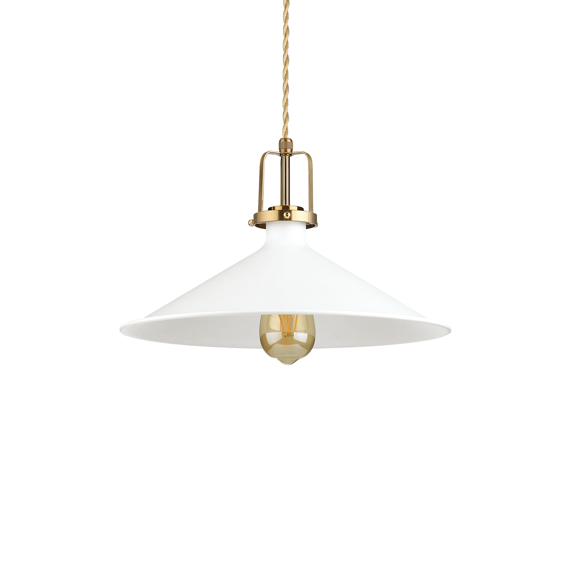 ERIS-4 SP1 white suspension lamp by Ideal Lux with metal frame with white painted ceiling rose and diffuser, satin gold finish details. Braided electrical cable with fabric covering. Bulb not included.
