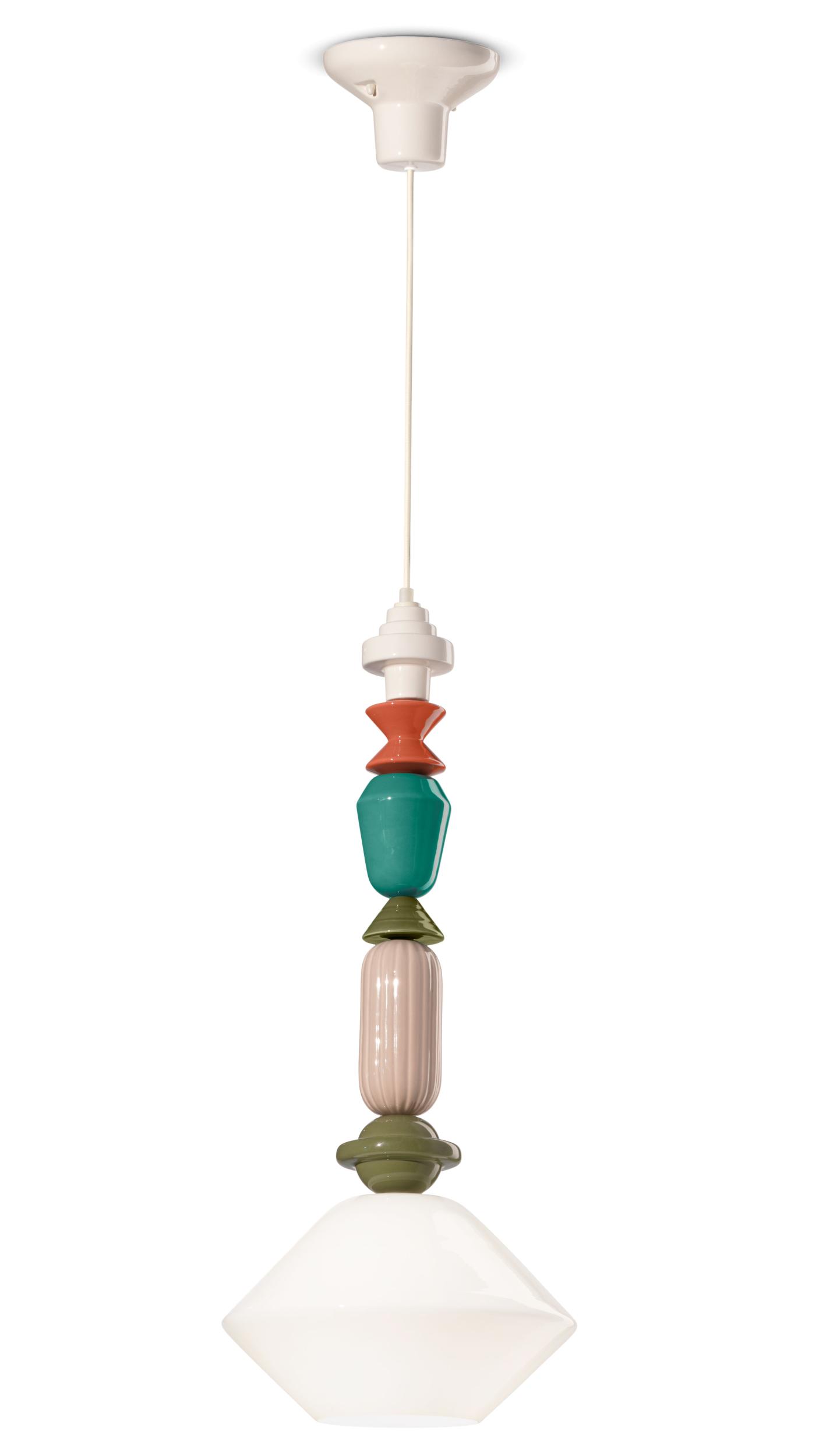 Like a jewel, the brilliant ceramic elements of Lariat follow one another vertically to form a variegated multicolored chain, which proceeds by alternating geometries until reaching the most precious element that is found at its end and which contains the luminous element. Lariat exists in different versions and variations, to compose different lengths and types of use, all composed of small ceramic beads with shiny enamel and fresh and contemporary colors.