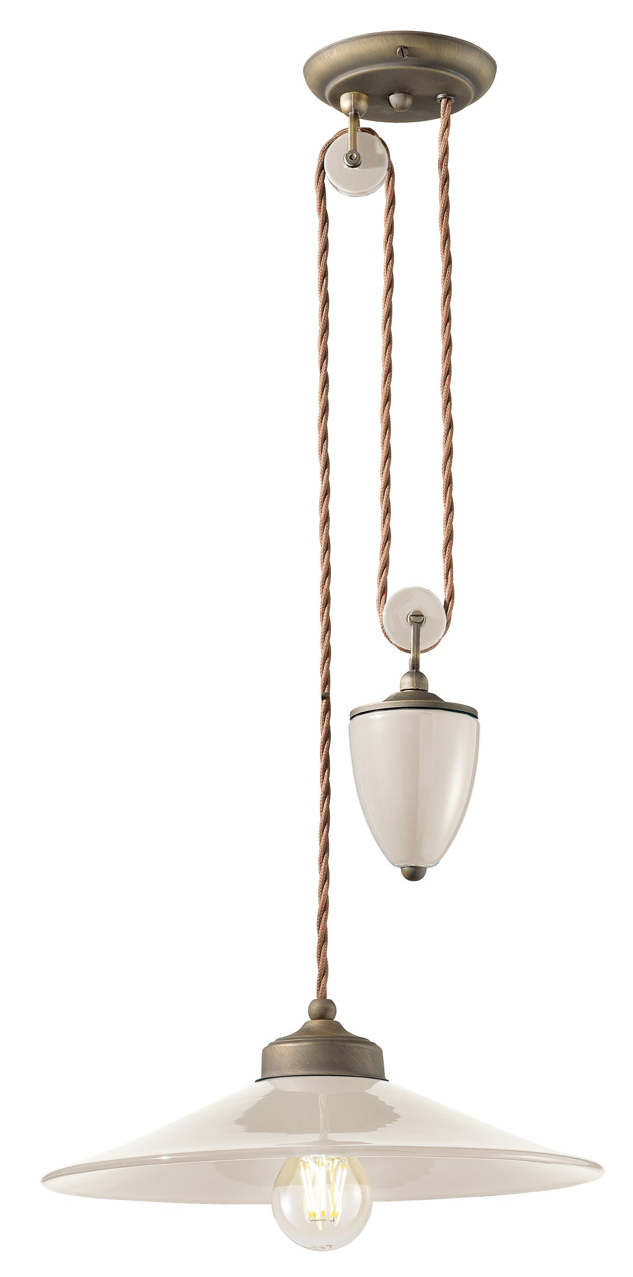 Suspension light D.35 RETRO' COLORS C1632 by Ferroluce with main material: ceramic, covered cotton cable, metal parts in satin burnished brass, type of painting: burnishing and spray painting.