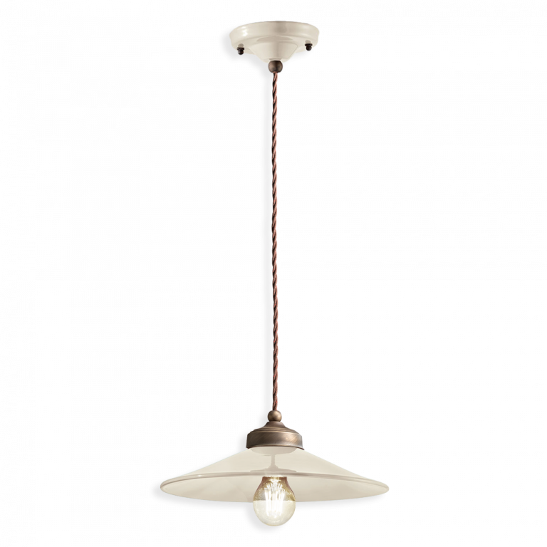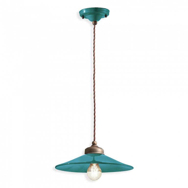 Suspension RETRO' COLORS C1635 by Ferroluce with main material: ceramic, covered cotton cable, metal parts in satin burnished brass, type of painting: burnishing and spray painting.