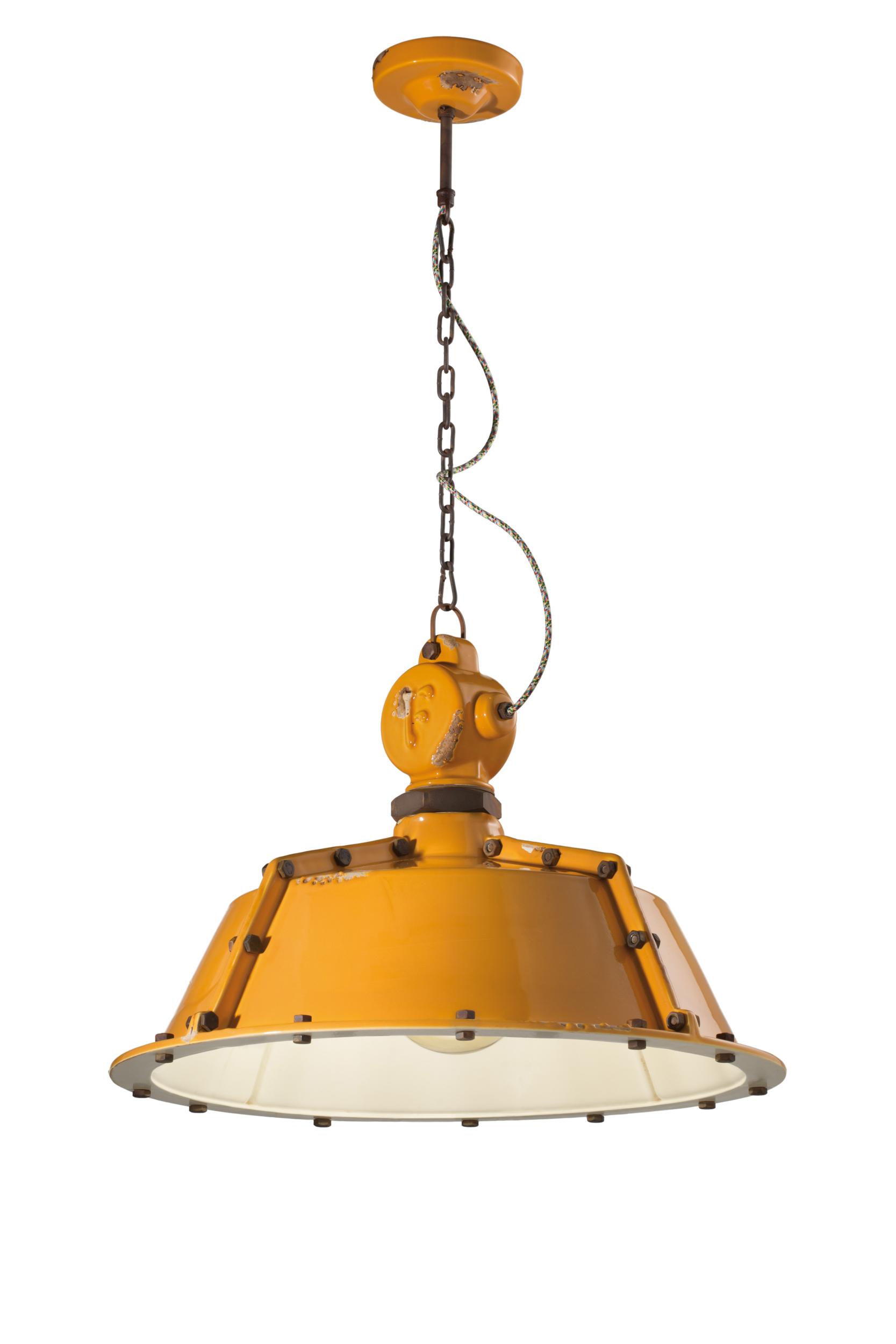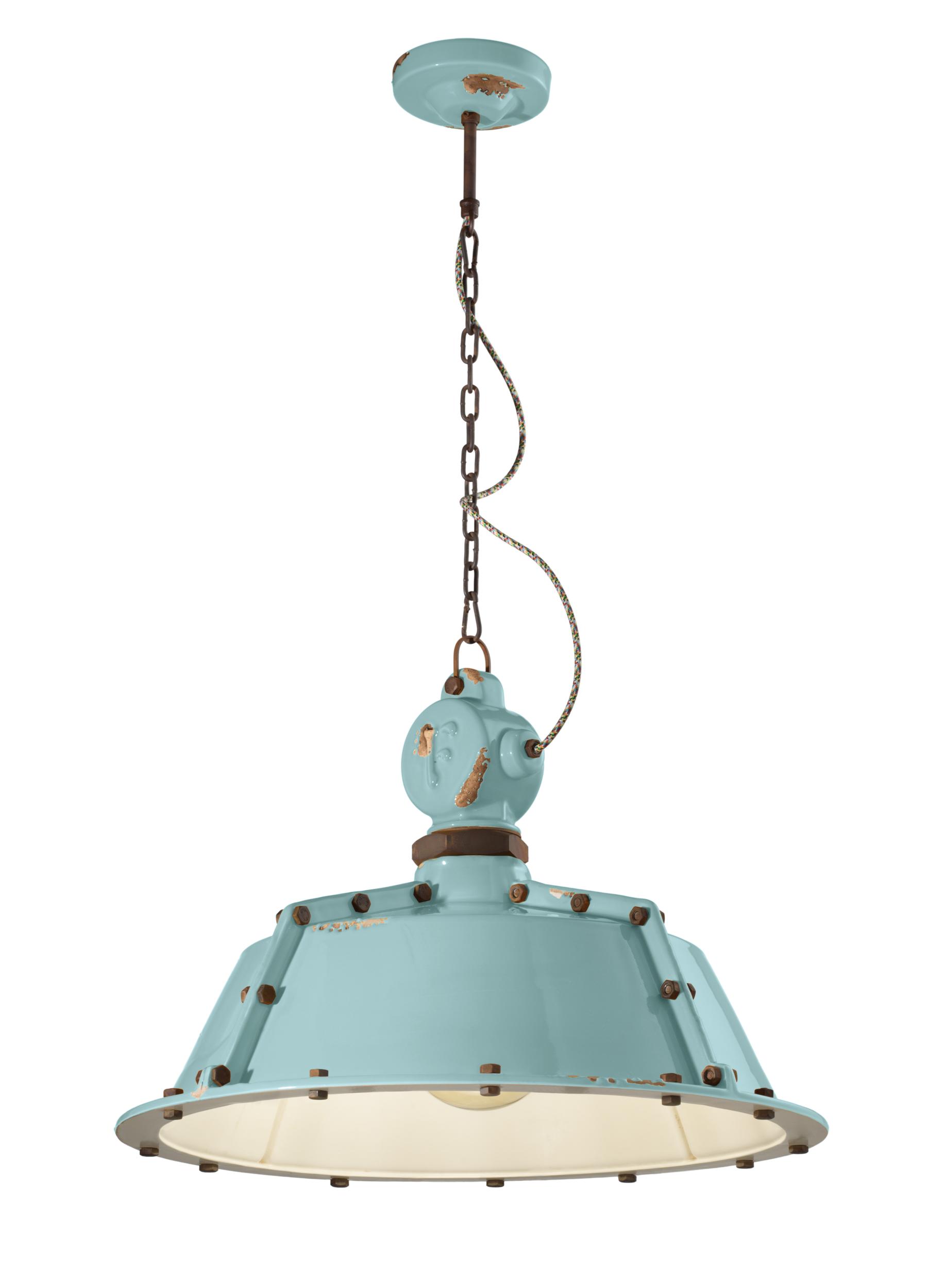Suspension RETRO' INDUSTRIAL C1720 by Ferroluce. Ceramic lamp with metal parts and chain in antiqued corten iron and multicoloured coated cotton cable.