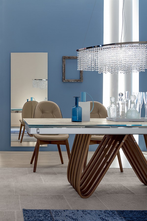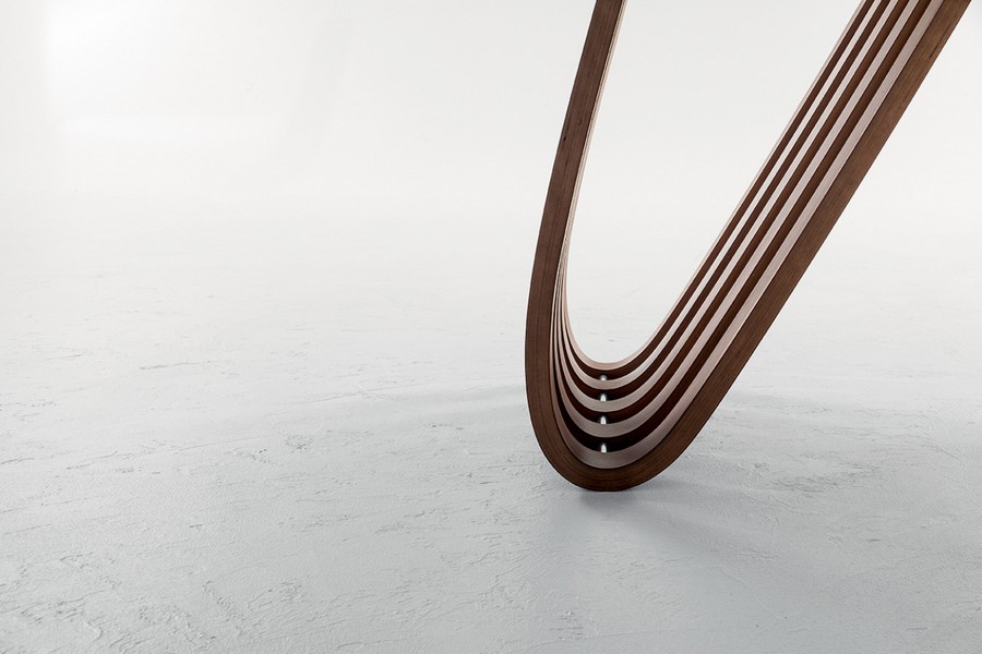 Tonin Casa Harp Table is a table with a multilayer base in curved and veneered veneered walnut or dark oak, thermotrated with fixed or extensible glass, wood or ceramic tiles in different types of finishes. A harmonious table in both shapes and materials. A fixed version, classic like the music to which it is inspired; an extensible version with an aluminum rail, contemporary and functional. The design is bold, and features the entire Arpa program, which has a console beside the table.