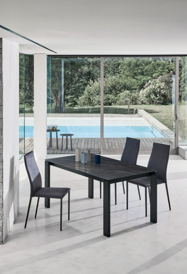 Tai Flex chair by Bontempi with lacquered steel frame padded and covered in fabric, eco-leather, leather or leather fibre. The Tai Flex chair by Bontempi has the same appearance and dimensions as its sister Tai but is characterised by the flexible ergonomic backrest.