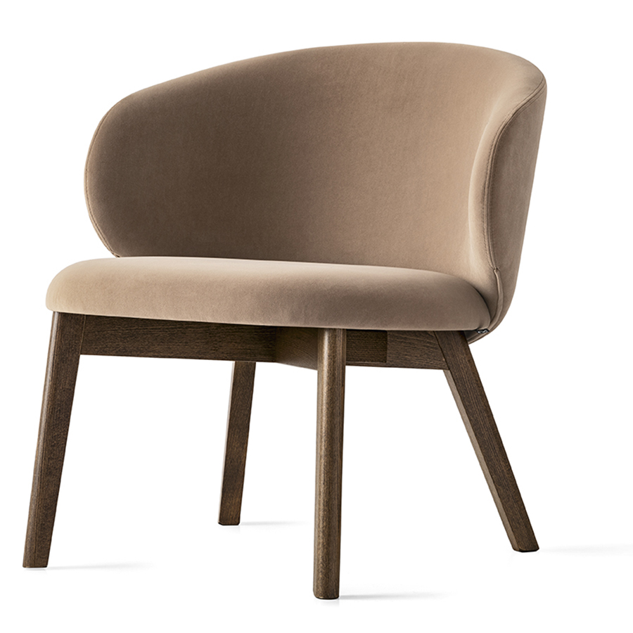 Tuka CB2113 armchair by Connubia, padded and enveloping with 4 wooden legs and fixed padded and upholstered shell with very enveloping backrest, also comfortable for use directly at the table.