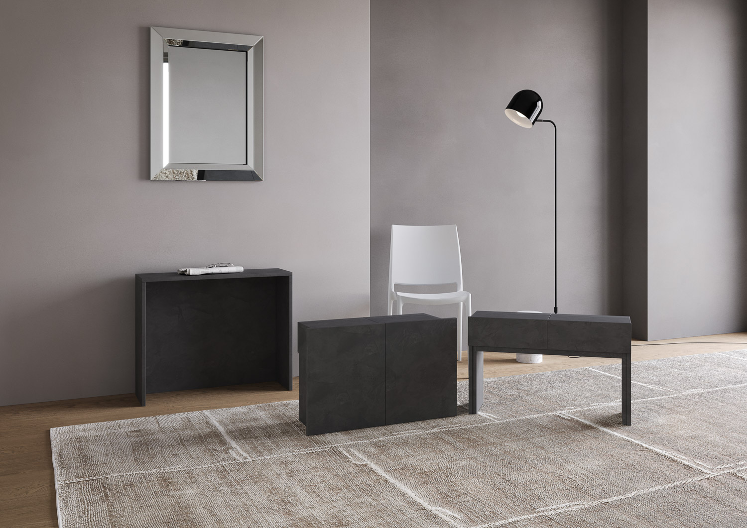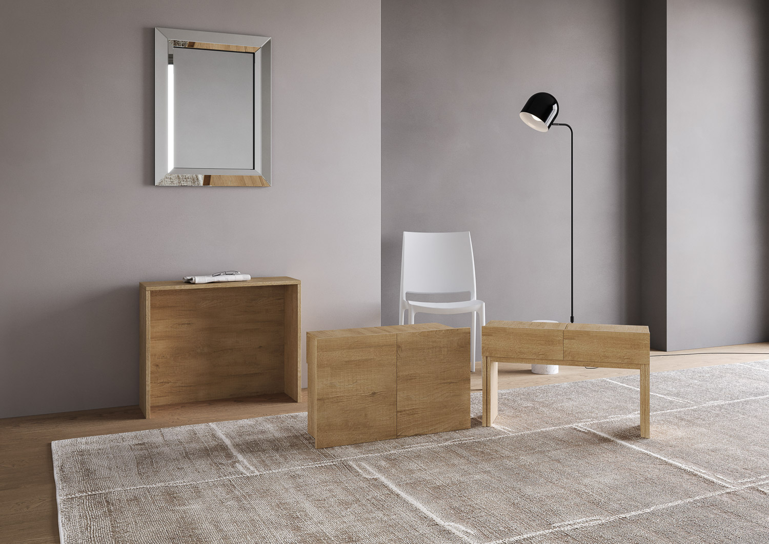 Evolve extendable benches. Two extendable stackable benches supplied as a pair. When closed they take up little space, as they can be stacked on top of each other. If necessary, each bench can be extended up to 300 cm, allowing it to accommodate up to 6 people each, thus bringing the total capacity to 12 people. Each bench is equipped with 4 extensions of 57 cm each. When not in use, the 8 extensions can be positioned inside a storage compartment created inside the structure of the lower bench. The lower bench is equipped with practical wheels for easy movement. Extension mechanism with sturdy telescopic aluminum guides. Made with melamine panels. Itamoby product Made in Italy Dimensions of the benches when stacked: L.72 D.26 H.60 cm Dimensions of the benches: Closed bench: L.72 D.26 H.45 cm Length with 1 extension: 129 cm Length with 2 extensions: 186 cm Length with 3 extensions: 243 cm Length with 4 extensions: 300 cm