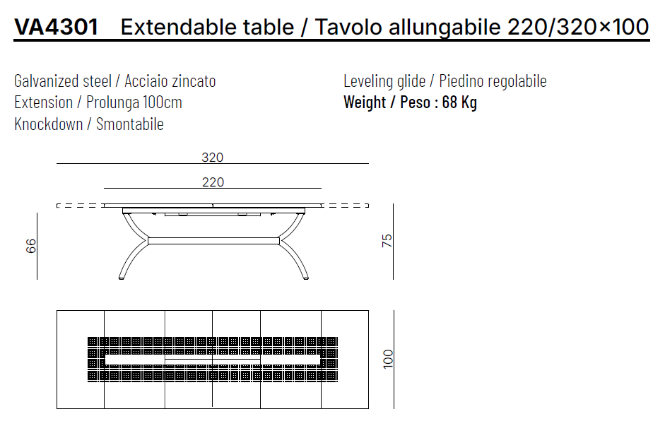 cm: L. 220/320 x D. 100 x H. 75 (rectangular extendable)