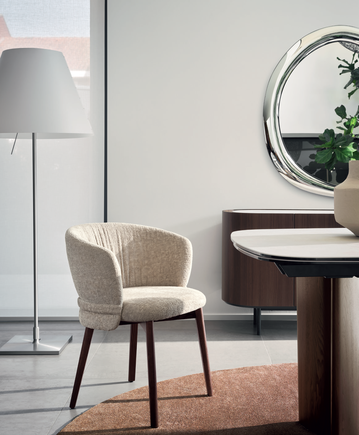 Vanilla is a chair whose proportions and comfort are reminiscent of a small armchair. Inspired by the world of fashion, it features distinctive gathers in the fabric and a horizontal element that encircles the backrest like a belt. Both the wooden and metal legs enhance its innate elegance.